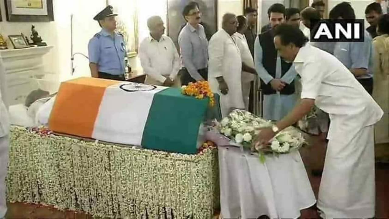 இன்று காலை முதல் ஆளாய் கமலாலயம் சென்ற ஸ்டாலின் வாஜ்பாயி அஸ்தி கலசத்துக்கு அஞ்சலி செலுத்தினார். அவரைத் தொடர்ந்து கனிமொழியும் அஞ்சலி செலுத்தினார்.