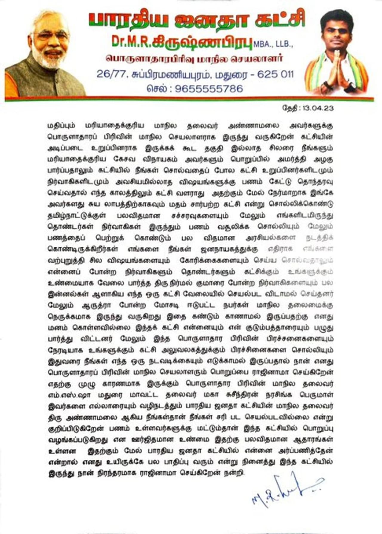 மேலும் ஆருத்ரா போன்ற மோசடி ஈடுபட்ட நபர்கள் மாநில தலைமைக்கு நெருக்கமாக இருந்து வருகிறது. இதை கண்டும் காணாமல் இருப்பதற்கு எனது மனம் கொள்ளவில்லை. இந்தக் கட்சி என்னையும் என் குடும்பத்தாரையும் பழுது பார்த்து விட்டனர். மேலும் இந்த பொருளாதார பிரிவின் பிரச்சனைகளையும் நேரடியாக உங்களுக்கும் கட்சி அலுவலகத்துக்கும் பிரச்சினைகளை சொல்லியும் இதுவரை நீங்கள் எந்த ஒரு நடவடிக்கையும் எடுக்காமல் இருப்பதால் நான் எனது பொருளாதாரப் பிரிவின் மாநில செயலாளரும் பொறுப்பை ராஜினாமா செய்கிறேன்.