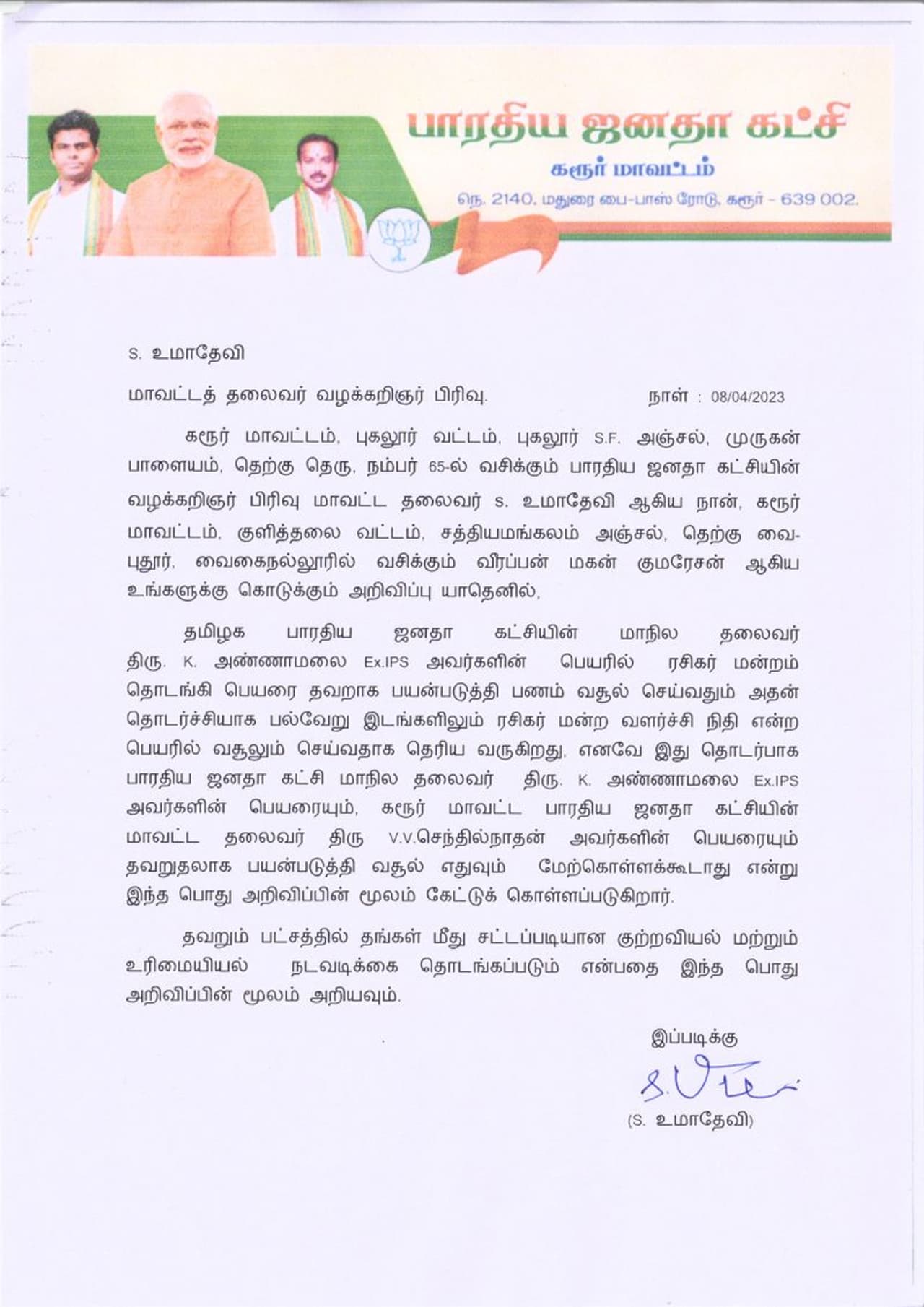 பாஜக மாநில தலைவராக இருப்பவர் அண்ணாமலை, இவரது அதிரடி அரசியலுக்கு பாஜகவில் இளைஞர்கள் ரசிகர்களாக இருந்து வருகின்றனர். இதனையடுத்து சமூக வலைதளத்தில் அண்ணாமலை பேன் கிளப், அண்ணாமலை ஆர்மி என தொடங்கி அண்ணாமலையில் பேச்சுக்களை பதிவு செய்து வருகின்றனர். இந்தநிலையில் அண்ணாமலை ரசிகர் மன்றம் என்ற பெயரில் பணம் வசூலிக்கப்படுவதாக தற்போது வெளியாகியுள்ள புகார் பரபரப்பை ஏற்படுத்தியுள்ளது. இதனையடுத்து கரூர் மாவட்ட பாஜக வழக்கறிஞர் பிரிவு மாவட்ட தலைவர் உமாதேவி சார்பில் பொது அறிவிப்பு ஒன்று வெளியிடப்பட்டுள்ளது. இதில் கரூர் மாவட்டம் புகலூர் வட்டம் பகுதியில் வசிக்கும் பாரதிய ஜனதா கட்சியின் வழக்கறிஞர் பிரிவு மாவட்ட தலைவர் உமாதேவி ஆகிய நான், கரூர் மாவட்டம், குளித்தலை வட்டம், சத்தியமங்கலம் பகுதியில் வசிக்கும் வீரப்பன் மகன் குமரேசன் ஆகிய உங்களுக்கு கொடுக்கும் அறிவிப்பு யாதெனில்,