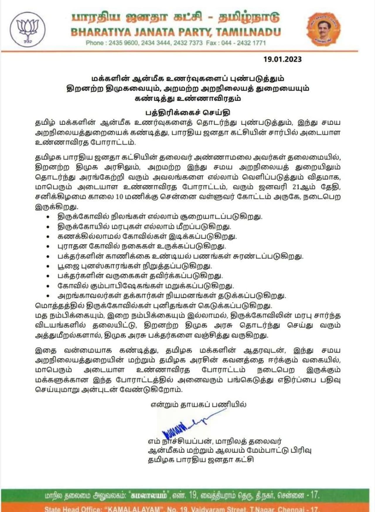 தமிழக பாரதிய ஜனதா கட்சியின் தலைவர் அண்ணாமலை அவர்கள் தலைமையில், திறனற்ற திமுக அரசிலும், அறமற்ற இந்து சமய அறநிலையத் துறையிலும் தொடர்ந்து அரங்கேற்றி வரும் அவலங்களை எல்லாம் வெளிப்படுத்தும் விதமாக, மாபெரும் அடையாள உண்ணாவிரத போராட்டம், வரும் ஜனவரி 21ஆம் தேதி, சனிக்கிழமை காலை 10 மணிக்கு சென்னை வள்ளுவர் கோட்டம் அருகே, நடைபெற இருக்கிறது.