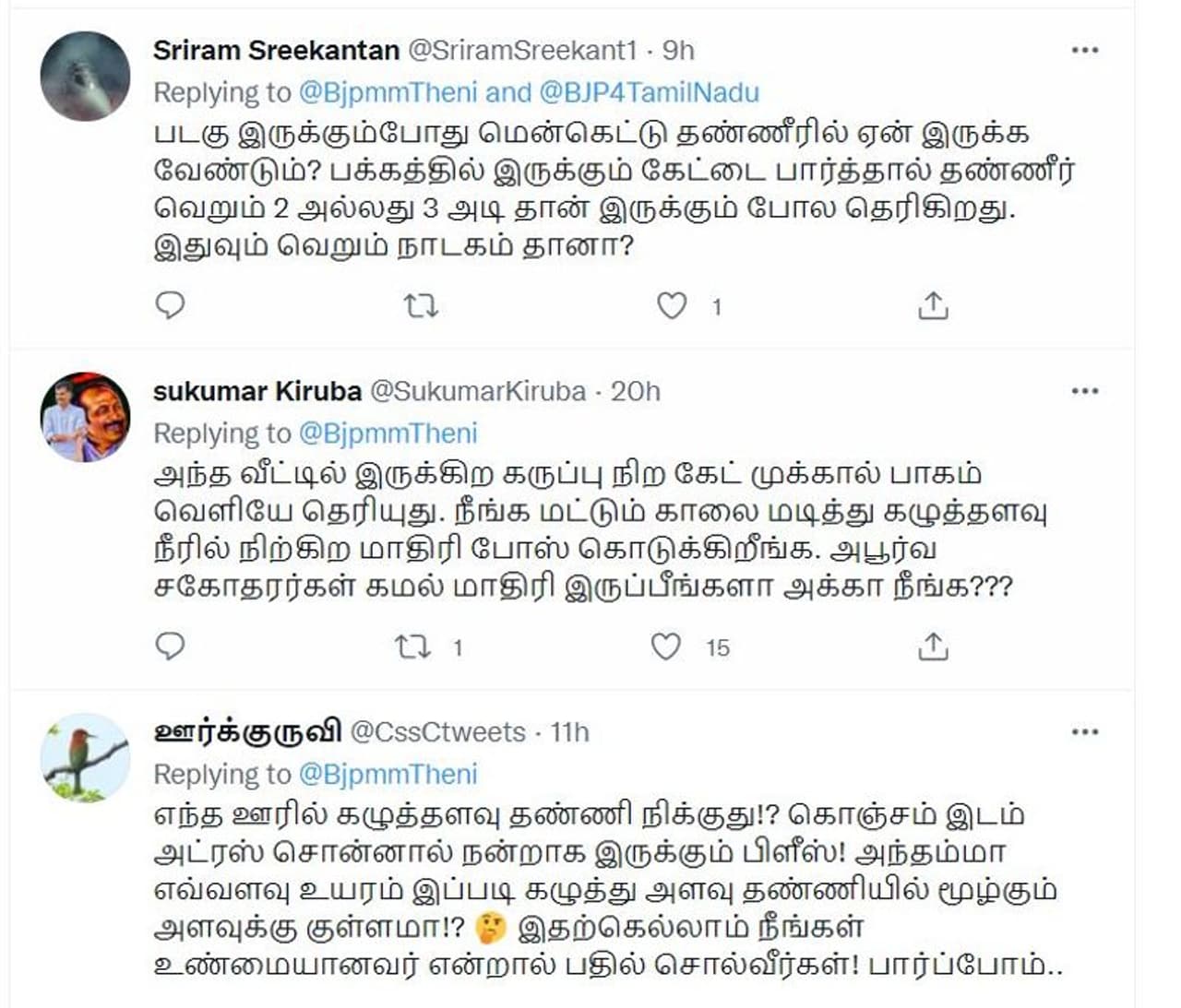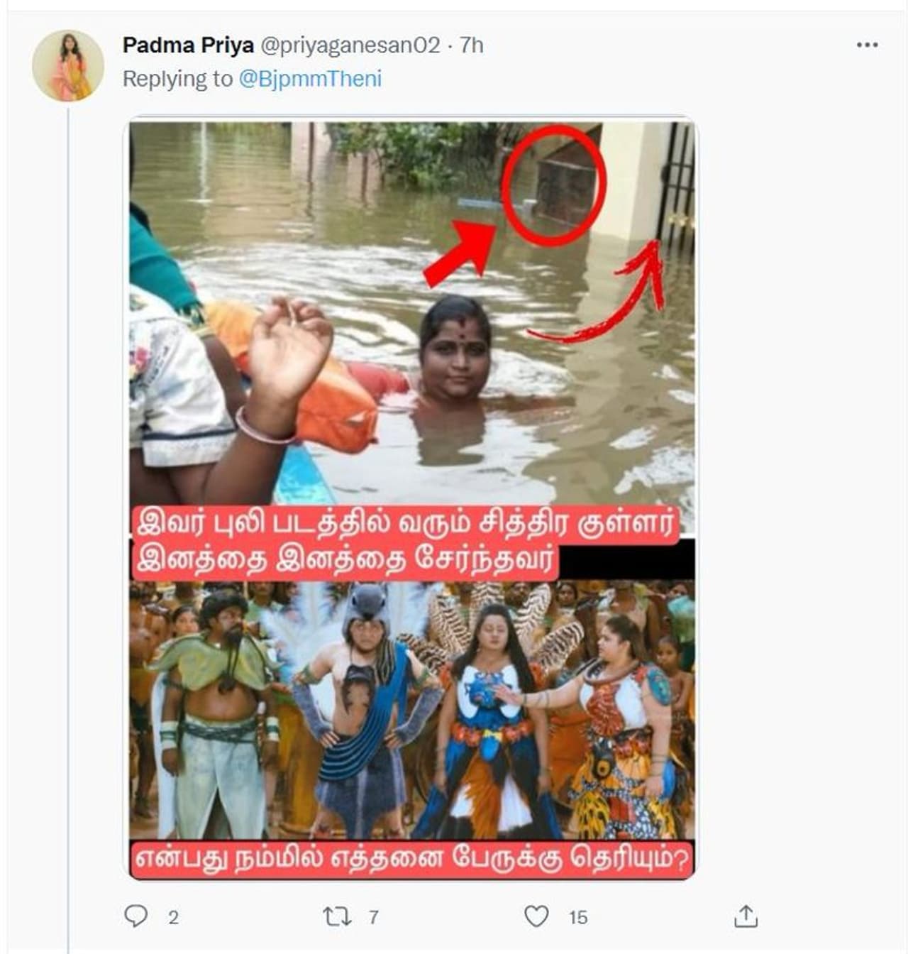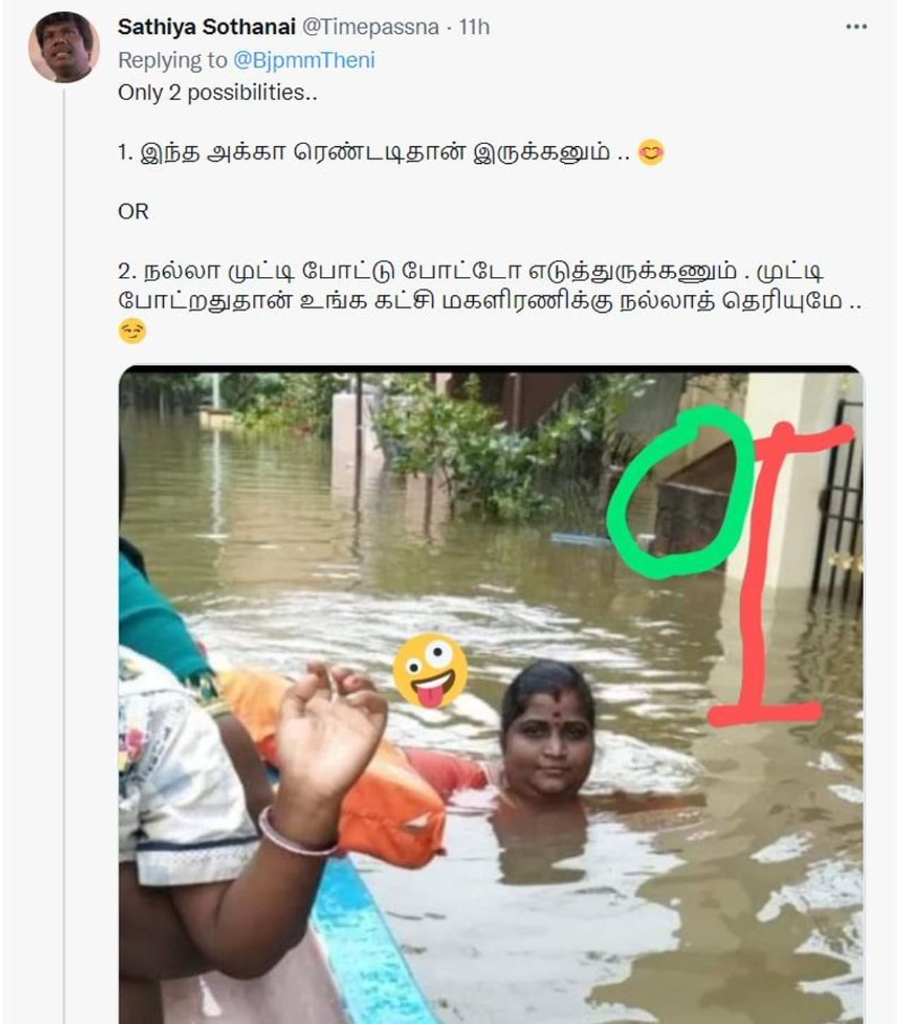 கலா அறிவுச்செல்வம் முழங்கால் அளவு தண்ணீரில் உட்கார்ந்து கொண்டு போட்டோ எடுத்துள்ளார். அது எப்படி… ஒரு ஆள் உயர மனிதன் அளவுக்கு தண்ணீர் வரும்.. அப்படியே இருந்தாலும் அவரின் போட்டோவில் காணப்படும் வீடுகளின் கேட் எப்படி உயரம் குறைவாக இருந்தது என்று கேள்வி கேட்டு தாளித்து வருகின்றனர்.