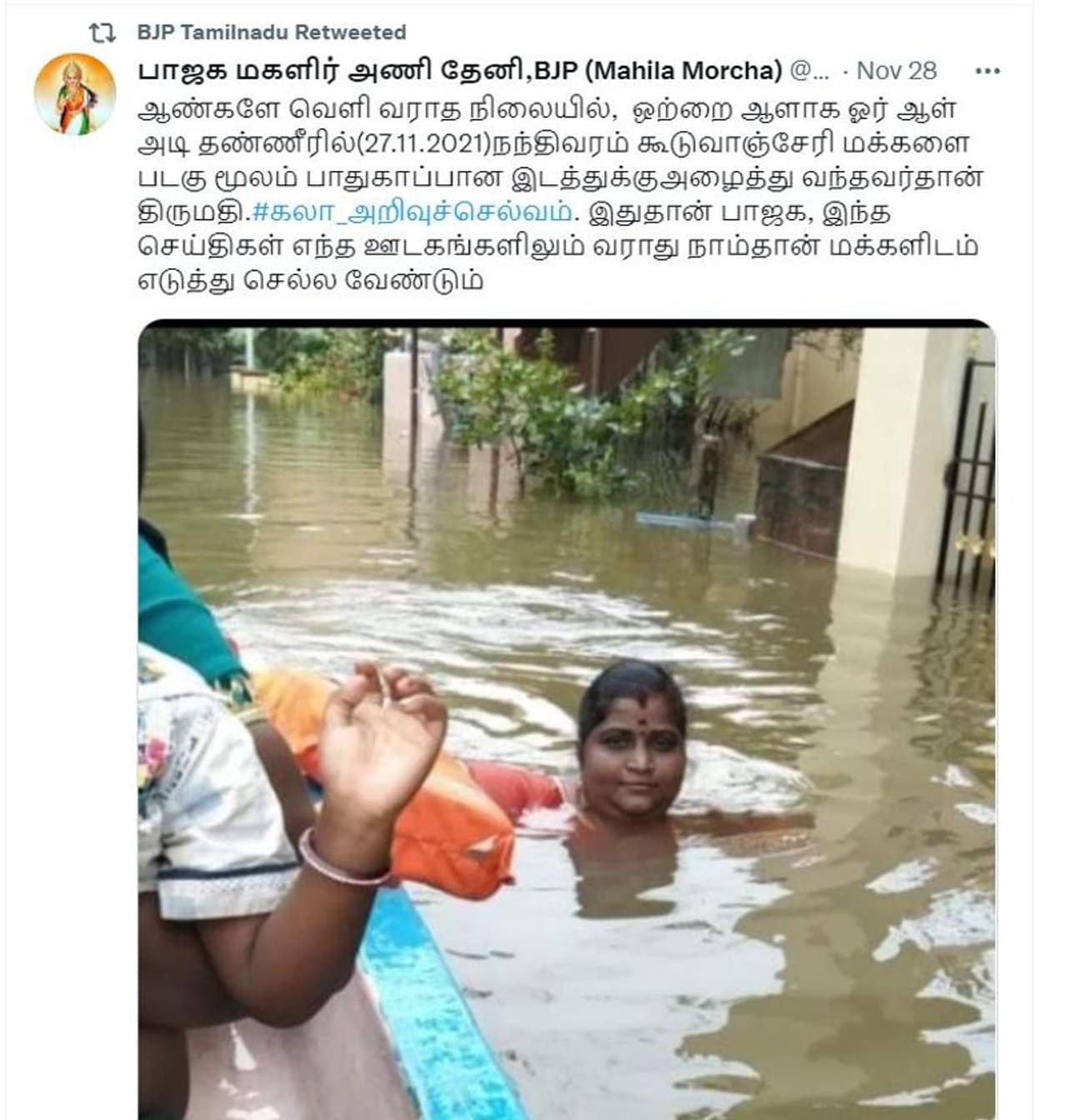 அப்படித்தான் பாஜக பெண் பிரமுகர் கலா அறிவுச்செல்வம் என்பவர் மழையில் சிக்கியவர்களை படகில் சென்று தனியாளாக காப்பாற்றினார் என்று ஒரு செய்தி இணையத்தில் வைரலானது.