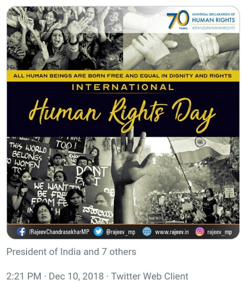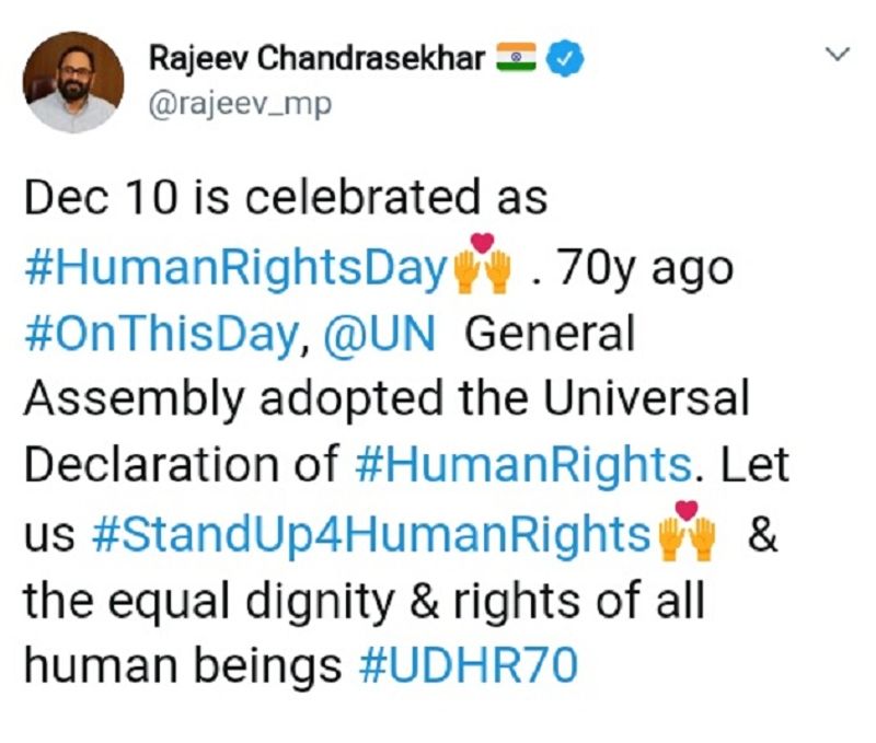 இது தொடர்பாக பாஜக மாநிலங்களவை உறுப்பினர் ராஜீவ் சந்திரசேகர் தனது டுவிட்டர் பக்கத்தில், 70 ஆண்டுகளுக்கு முன்பு இதே நாளில் , டிசம்பர் 10 ஆம் தேதியை மனித உரிமை தினமாக ஐக்கிய நாடுகள் சபை அங்கீகரித்ததை நினைவு கூர்ந்துள்ளார்.