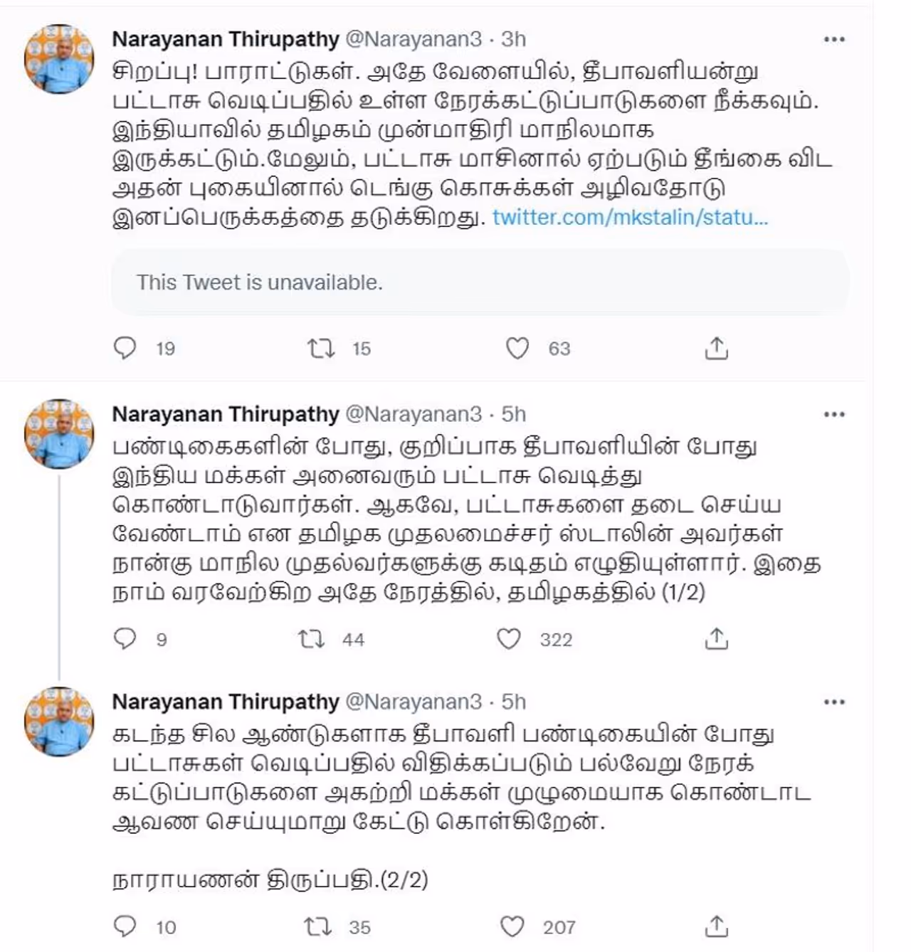தீபாவளி தருணத்தில் பட்டாசு வெடிக்க அனுமதி அளிக்க வேண்டும் என்று 4 மாநில முதல்வர்களுக்கு ஸ்டாலின் எழுதிய கடிதத்திற்கு பாஜக பிரமுகர் நாராயணன் திருப்பதி பாராட்டு தெரிவித்து உள்ளார்.