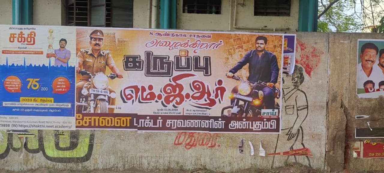 ரஜினி அரசியலுக்கு முழுக்குபோட்டுவிட்டார். நடிகர் விஜய்யை எம்ஜிஆருடன் ஒப்பிட்டு அவரது ரசிகர்கள் ஒரு பக்கம் பேசி வருகின்றனர். பாமக அன்புமணி நடிகர் கமலஹாசன் ஆகியோரும் எம்ஜிஆரை கையிலெடுத்து விளம்பரம் செய்து வருகின்றனர். இந்நிலையில் அரசியலுக்கு வந்து ஒரு சில ஆண்டுகளே ஆனா பாஜக மாநிலத் தலைவர் அண்ணாமலையை அக்கட்சித் தொண்டர்கள் எம்ஜிஆருடன் ஒப்பிடுகின்றனர். இந்நிலையில் மதுரையில் பாஜக நிகழ்ச்சி ஒன்று நடைபெற உள்ள நிலையில் மதுரை அவுட் போஸ்ட் பகுதியில் வித்தியாசமான போஸ்டரை பாஜகவினர் ஒட்டியுள்ளனர். எட்டு ஆண்டு சாதனை விளக்க அழைக்கிறார் கருப்து எம்ஜிஆர் அண்ணாமலை என ஒருபுறம் அண்ணாமலையில் புகைப்படமும் மறுபுறம் பாஜக மதுரை மாவட்ட பொறுப்பாளர் டாக்டர் சரவணன் போலீஸ் உடையில் இருப்பது போன்ற ஒட்டப்பட்டுள்ளது.போஸ்டரும் வைரலாகி வருகினது.