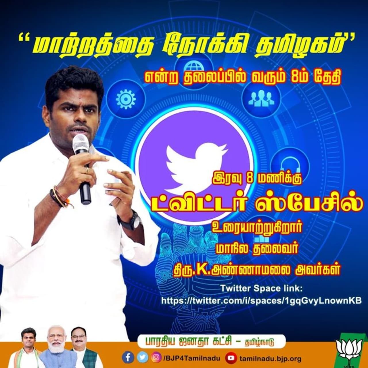 திமுகவுக்கு எதிராக பரப்படும் பொய் செய்திகளை ஐடி விங் திறமையாக எதிர்கொள்கிறார்கள்.அதே நேரத்தில் இன்னும் கூடுதல் வேகத்துடன் செயல்பட வேண்டும் என கேட்டு கொள்கிறேன்’ என்று பேசினார். இந்த நிலையில் திமுக போட்ட அதே பிளானை தமிழக பாஜக காப்பி அடித்து அதனை போலவே ட்விட்டரில் ஸ்பேஸ் நிகழ்ச்சியை நடத்த உள்ளது. தமிழக பாஜக வெளியிட்டுள்ள பதிவில், ‘"மாற்றத்தை நோக்கி தமிழகம்" என்ற தலைப்பில் ட்விட்டர் ஸ்பேசில்" உரையாற்றுகிறார் அண்ணாமலை. நாளை இரவு 8 மணிக்கு என்று குறிப்பிடப்பட்டுள்ளது.
