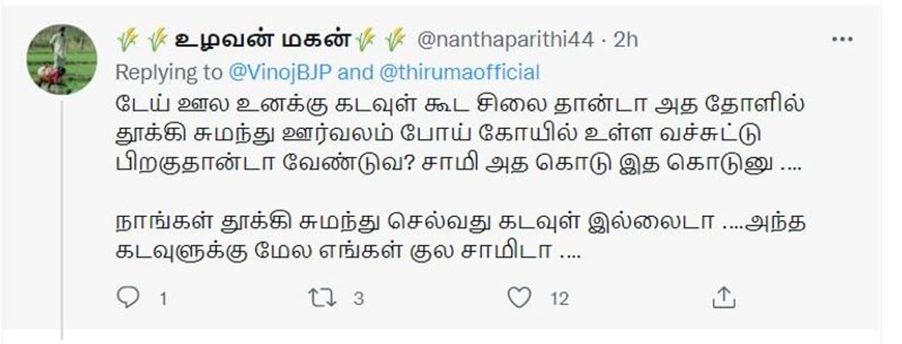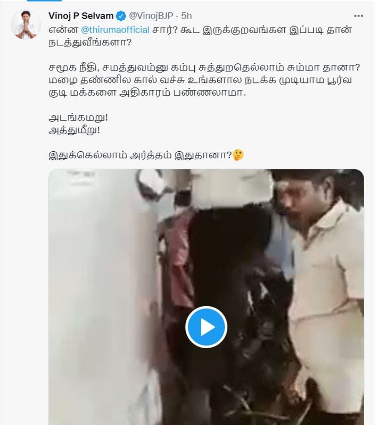 திருமாவின் இந்த வீடியோவை பார்த்த பாஜகவின் வினோஜ் செல்வம் டுவிட்டரில் ஒரு பதிவை வெளியிட்டு உள்ளார். அந்த பதிவில் அவர் கூறி இருப்பதாவது: