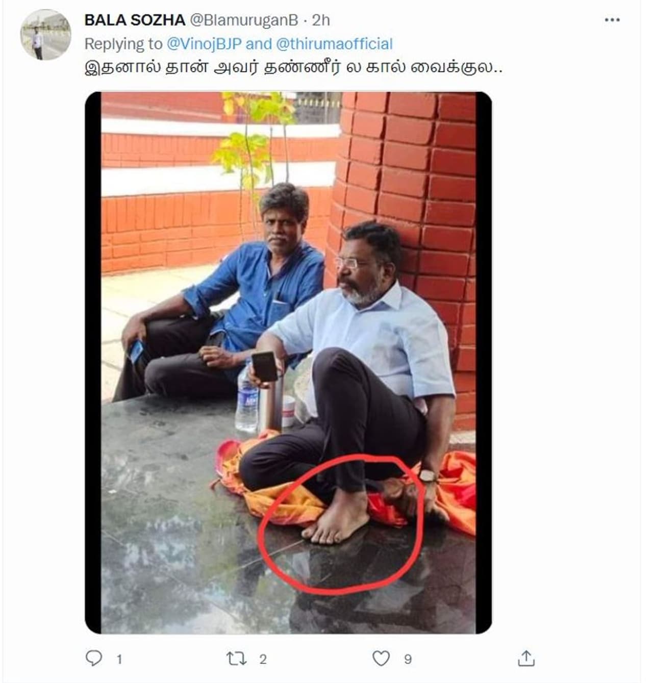இந்த பதிவை கண்ட சிறுத்தைகளோ அனல் பறக்கும் பதிலடிகளை போட்டு தாக்கி உள்ளனர். திருமாவளவனின் காலில் புண் இருப்பதால் தான் அவர் தண்ணீரில் கால் வைக்கவில்லை என்று பதில் கூறி உள்ளனர்.