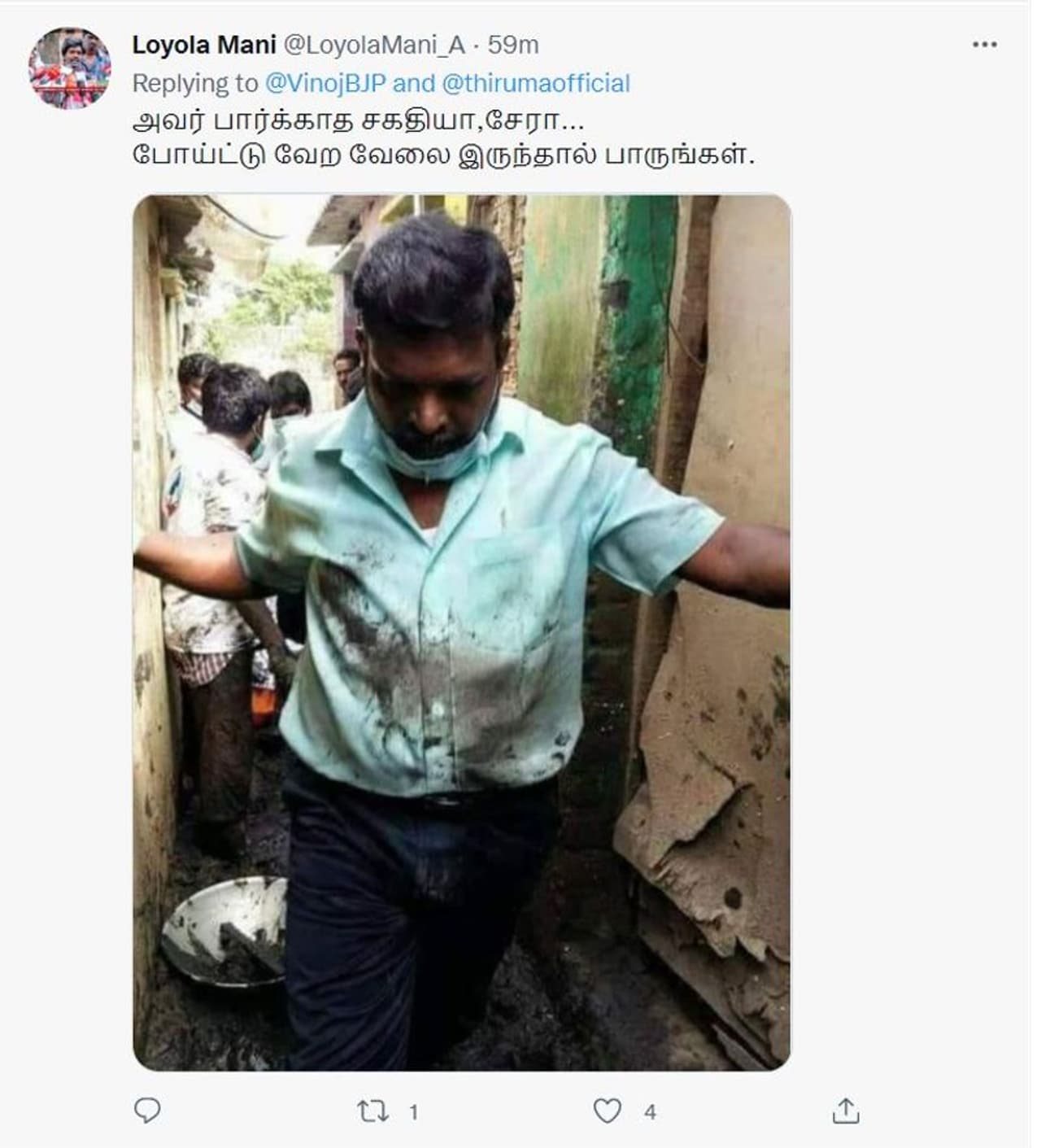 திருமா எங்களின் கடவுள், அவரது கால் படாமல் தோளில் சுமந்து செல்வது சிறுத்தைகளுக்கு பாக்யம் என்று சிலர் பதிவிட்டு இருக்கின்றனர். அவர் பார்க்காது சேறும், சகதியுமா, வேற வேலை இருந்தால் பாருங்கள் என்று திருப்பி கமெண்ட் போட்டுள்ளனர்.