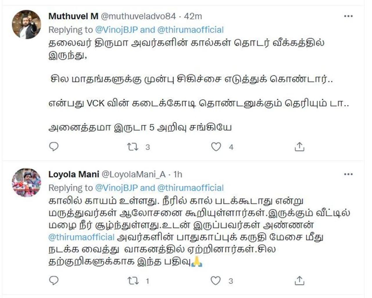 அவர் ஏன் அப்படி சென்றார் என்று ஒரு அன்பர் பதிவிட்டு உள்ளார். அவரது கால்கள் தொடர் வீக்கத்தில் இருந்ததால் சில மாதங்களுக்கு முன்பு சிகிச்சை எடுத்துக் கொண்டார். இது விசிக கடைசி கோடி தொண்டனுக்கு தெரியும் என்று கூறி இருக்கிறார்.