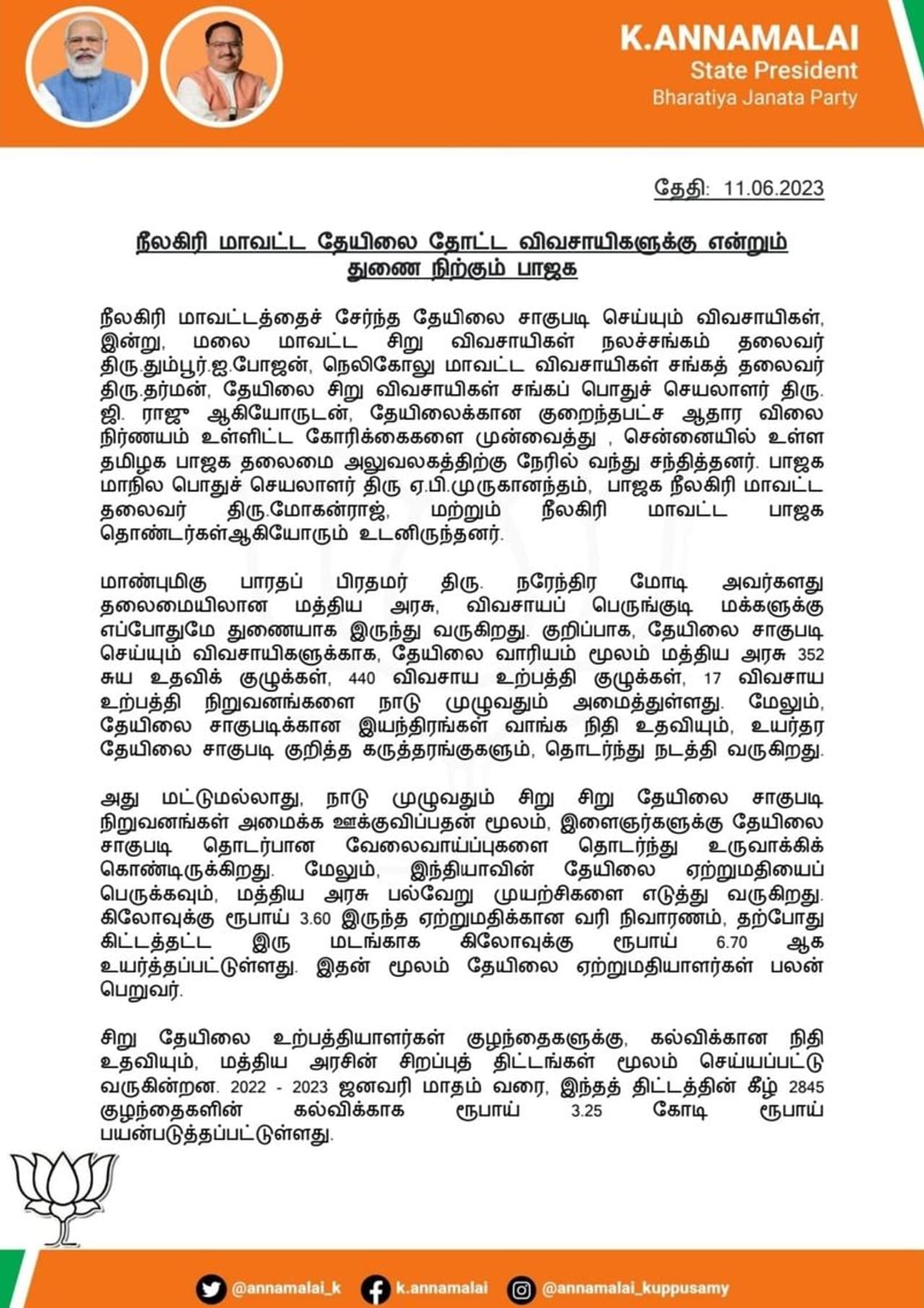 தமிழக பாஜக தலைவர் அண்ணாமலை வெளியிட்டுள்ள அறிக்கையில், “நீலகிரி மாவட்டத்தைச் சேர்ந்த தேயிலை சாகுபடி செய்யும் விவசாயிகள், இன்று, மாலை மாவட்ட சிறு விவசாயிகள் நலச்சங்கம் தலைவர் திரு தும்பூர்.ஐ.போஜன், நெலிகோலு மாவட்ட விவசாயிகள் சங்கத் தலைவர் திரு.தர்மன், தேயிலை சிறு விவசாயிகள் சங்கப் பொதுச் செயலாளர் திரு. ஜி. ராஜு ஆகியோருடன், தேயிலைக்கான குறைந்தபட்ச ஆதார விலை நிர்ணயம் உள்ளிட்ட கோரிக்கைகளை முன்வைத்து, சென்னையில் உள்ள தமிழக பாஜக தலைமை அலுவலகத்திற்கு நேரில் வந்து சந்தித்தனர்.