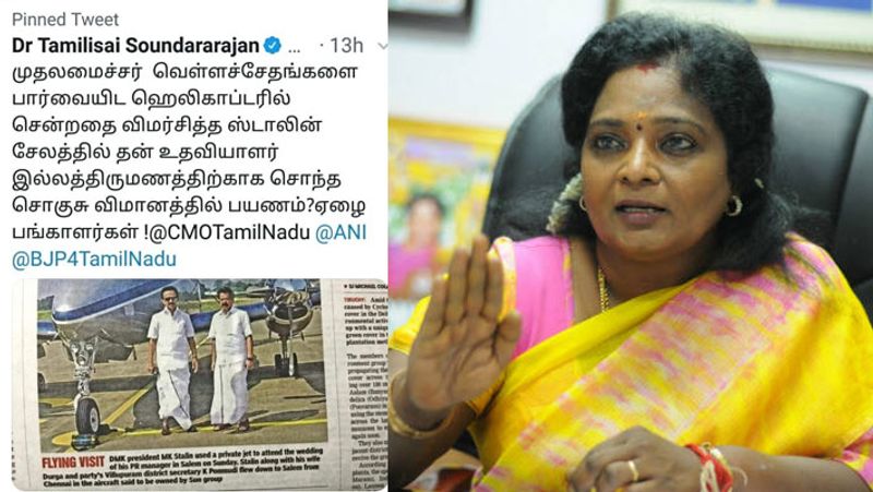 இந்நிலையில் இது தொடர்பாக தமிழிசையின் டுவிட்டர் பக்கத்தில் முதலமைச்சர் வெள்ளச் சேதங்களை பார்வையிட ஹெலிகாப்டரில் சென்றதை விமர்சித்த ஸ்டாலின், சேலத்தில் தன் உதவியாளர் இல்லத் திருமணத்திற்காக சொந்த சொகுசு விமானத்தில் பயணம்? ஏழை பங்காளர்கள்" எனப் பதிவிட்டிருக்கிறார்.