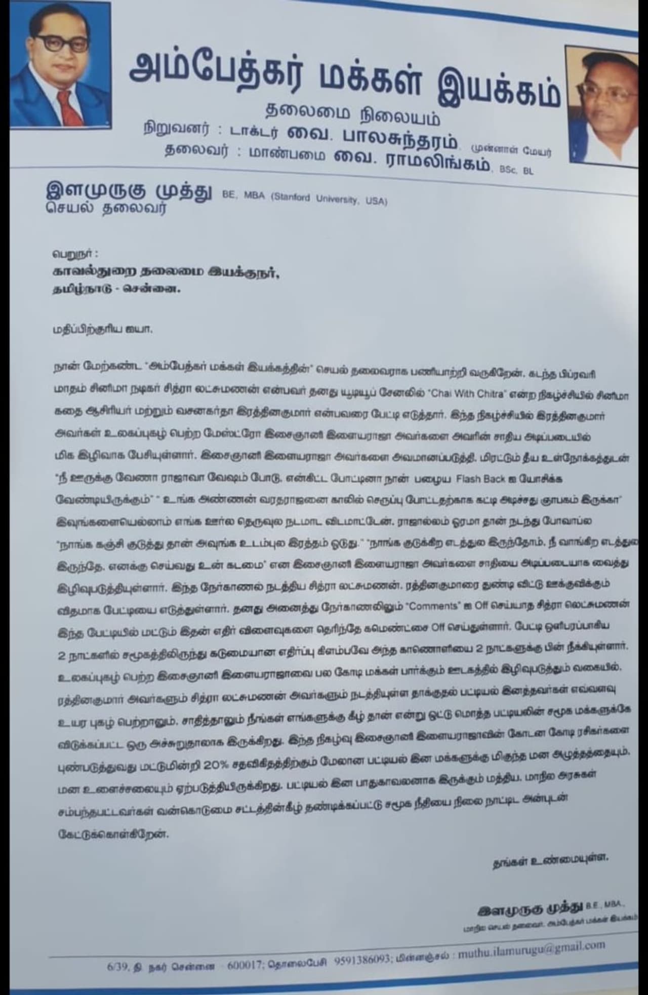 பின்னர் செய்தியாளர்களிடம் பேசிய இளமுருகு, கடந்த பிப்ரவரி மாதம் நடிகர் சித்ரா லட்சுமணன் தான் நடத்தும் "Chai with chithra" என்ற யூ டியூப் சேனல் நிகழ்ச்சியில் திரைப்பட கதாசிரியரும் இயக்குனருமான ரத்னகுமாரை வைத்து பேட்டி எடுத்தார். இந்த பேட்டியில் ரத்னகுமார் என்பவர் இசைஞானி இளையராஜாவை அவரது சாதியை மையமாக வைத்து இழிவாக பேசினார். அதை சித்ரா லட்சுமணனும் அனுமதித்ததாக அவர் கூறினார்.