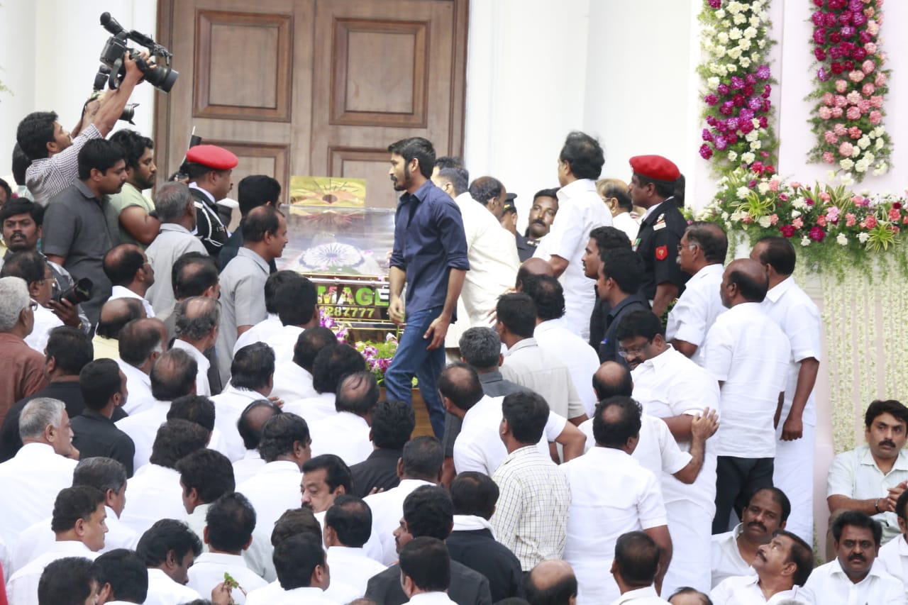 இதனால் தற்போது, ராஜாஜி ஹாலில் வைக்கப்பட்டுள்ள திமுக தலைவர் உடலுக்கு, பொதுமக்கள், அரசியல் தலைவர்கள், மற்றும் திரையுலகை சேர்ந்த பிரபலங்கள் தொடர்ந்து அஞ்சலி செலுத்தி வருகின்றனர்.