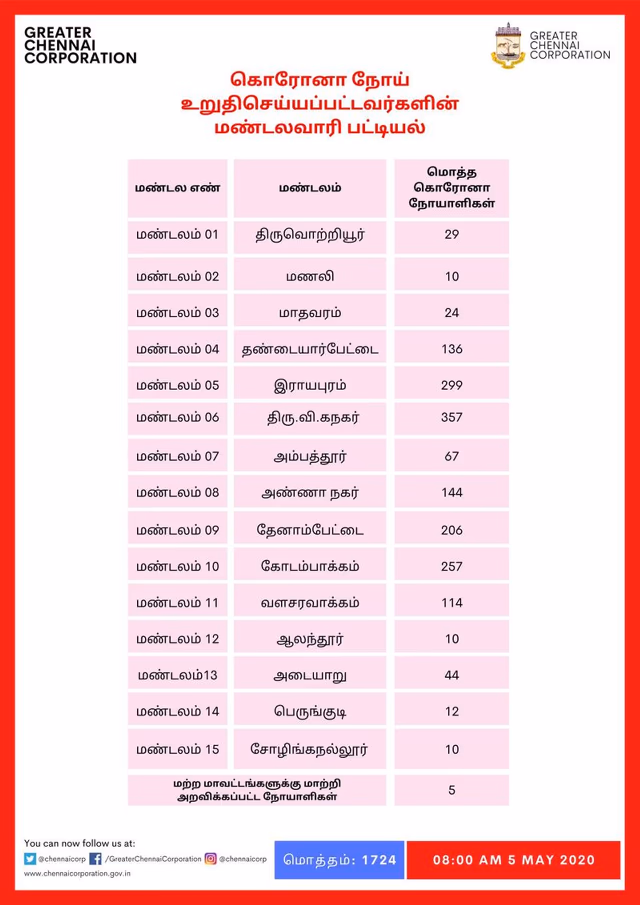 இந்நிலையில் மே 5 ஆம் தேதி காலை 8 மணி நிலவரப்படி சென்னையில் உள்ள மொத்தம் 15 மண்டலங்களில் மொத்தம் 1724 பேருக்கு கொரோனா தொற்று இருப்பது உறுதி செய்யப்பட்டுள்ளது . அதில் அதிகபட்சமாக திருவிக நகரில் சுமார் 357 பேருக்கு கொரோனா தொற்று இருப்பது உறுதி செய்யப்பட்டுள்ளது ராயபுரத்தில் 299 பேருக்கும், கோடம்பாக்கத்தில் 257 பேருக்கும் தேனாம்பேட்டையில் 206 பேருக்கும் அண்ணாநகரில் 144 பேருக்கும் தண்டையார்பேட்டையில் 136 பேருக்கும் வளசரவாக்கத்தில் 114 பேருக்கும் அம்பத்தூரில் 67 பேருக்கும் அடையாரில் 44 பேருக்கும் திருவெற்றியூரில் 29 பேருக்கும் மாதவரத்தில் 24 பேருக்கும் கொரோனா தொற்று இருப்பது உறுதி செய்யப்பட்டுள்ளது .மணலி , ஆலந்தூர் , சோழிங்கநல்லூர் உள்ளிட்ட இடங்களில் தலா 10 பேருக்கும் பெருங்குடியில் 12 பேருக்கும் கொரோனா தொற்று இருப்பதுஉறுதி செய்யப்பட்டுள்ளது