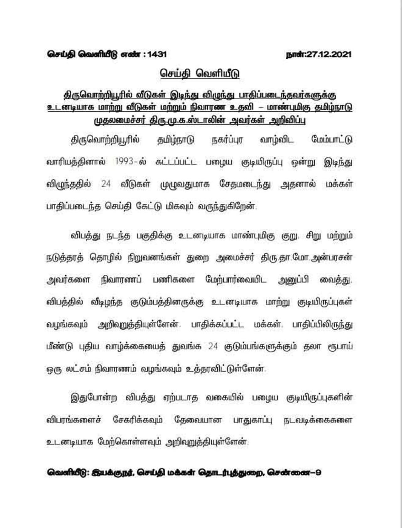 விபத்தில் வீடிழந்த குடும்பத்தினருக்கு உடனடியாக மாற்றுக் குடியிருப்புகள் வழங்கவும் அமைச்சரிடம் அறிவுறுத்தியுள்ளேன். பாதிக்கப்பட்ட மக்கள், பாதிப்பிலிருந்து மீண்டு புதிய வாழ்க்கையைத் தொடங்க 24 குடும்பங்களுக்கும் தலா ரூபாய் 1 லட்சம் நிவாரணம் வழங்கவும் உத்தரவிட்டுள்ளேன்.