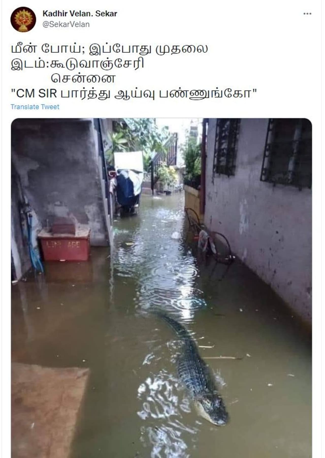 கூடுவாஞ்சேரி சாலையில் மழை நீர் வெள்ளம் போல பெருக்கெடுத்து ஓடுகிறது. இந்த சாலையில் முதலை இன்னமும் நீந்தி வருகிறது என்று தகவல் மக்களை அச்சத்தில் ஆழ்த்தியது. ஆனால் இது முதலை கிடையாது, மரக்கட்டை, மக்கள் அச்சம் கொள்ள வேண்டாம் என்று செங்கல்பட்டு கலெக்டர் அறிவித்து இருக்கிறார்.