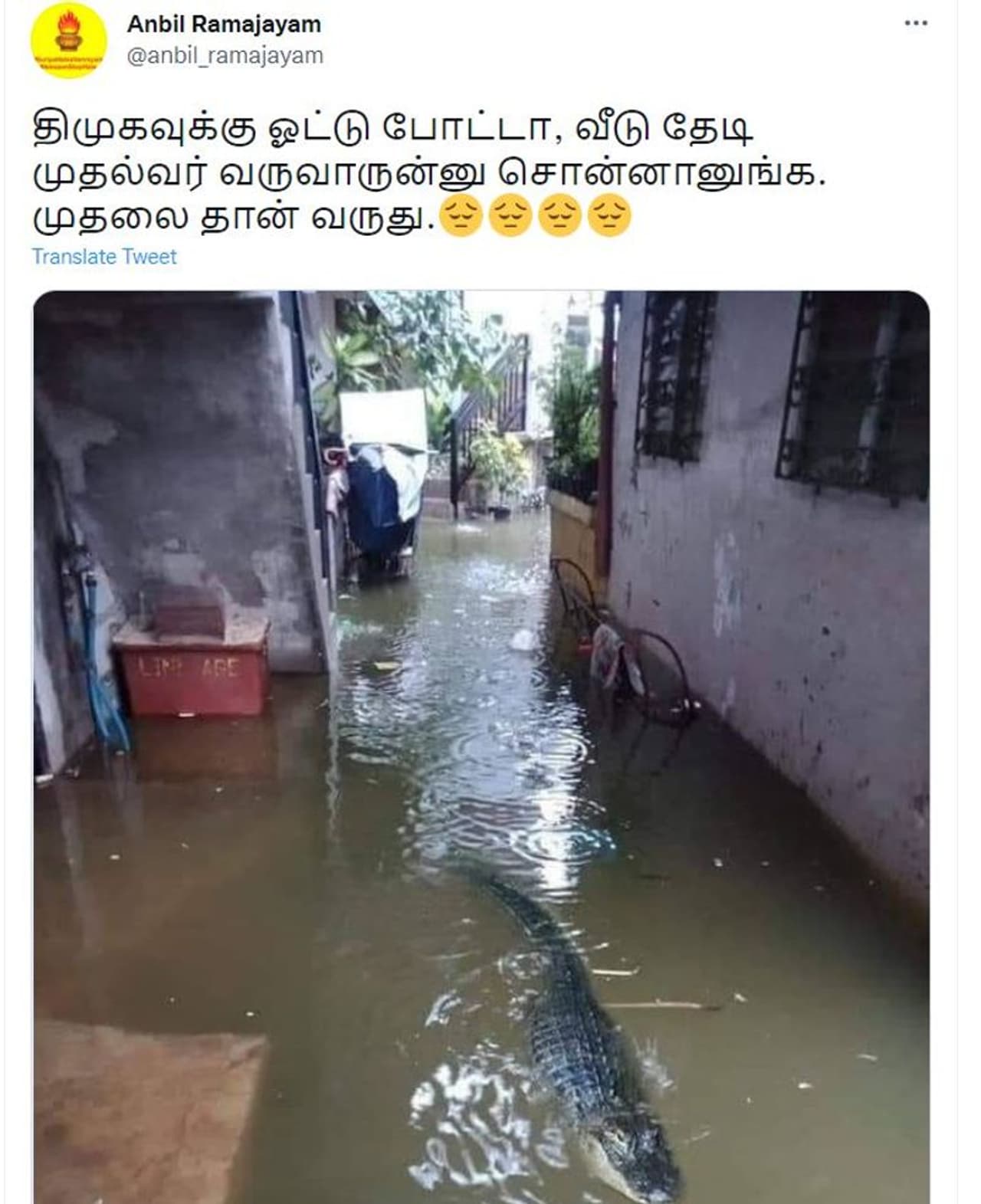 செங்கல்பட்டு உள்ளிட்ட பல இடங்களில் முதலை நீரில் நீந்தி செல்கிறது என்ற போட்டோ 2வது நாளாக உலா வர ஆரம்பிக்க திமுக மீதான விமர்சனங்களும் அதிகரித்து உள்ளன.