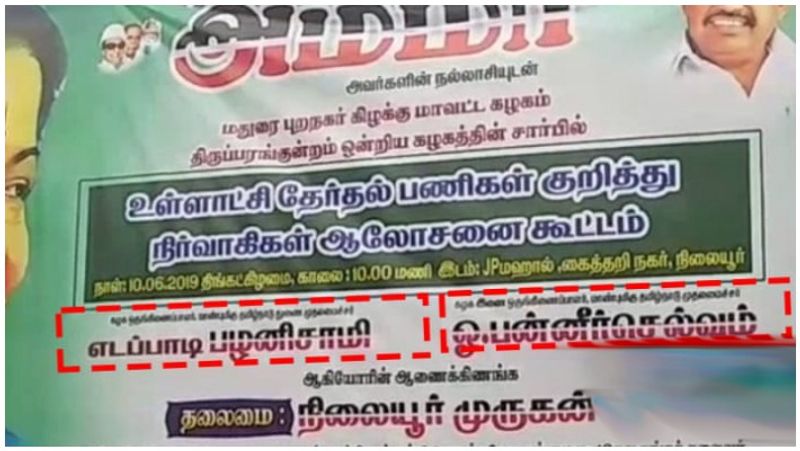 அந்த பேனரில் முதல்வர் மற்றும் துணை முதல்வரின் பெயர்கள் மாற்றி வைக்கப்பட்ட சம்பவம் சர்ச்சையை ஏற்படுத்தியுள்ளது.திருப்பரங்குன்றம் ஒன்றிய அதிமுக சார்பில் நேற்று உள்ளாட்சித் தேர்தலுக்கு ஆயத்தமாவதற்கான நிர்வாகிகள் கூட்டம் நிலையூர் கைத்தறி நகரில் நேற்று நடைபெற்றது. இதற்காக அங்கு வைக்கப்பட்ட பேனர் ஒன்றில் முதல்வர் ஓ.பன்னீர்செல்வம் என்றும், துணை முதல்வர் எடப்பாடி பழனிசாமி என்றும் குறிப்பிடப்பட்டிருந்தது.