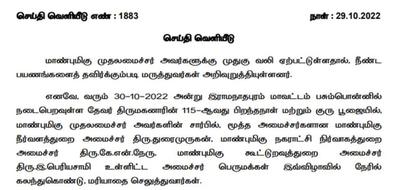 எனவே, வரும் 30-10-2022 அன்று இராமநாதபுரம் மாவட்டம் பசும்பொன்னில் நடைபெறவுள்ள தேவர் திருமகனாரின் 115-ஆவது பிறந்தநாள் மற்றும் குரு பூஜையில், மாண்புமிகு முதலமைச்சர் அவர்களின் சார்பில், மூத்த அமைச்சர்களான நீர்வளத்துறை அமைச்சர் துரைமுருகன், நகராட்சி நிர்வாகத்துறை அமைச்சர் கே.என்.நேரு. கூட்டுறவுத்துறை அமைச்சர் பெரியசாமி உள்ளிட்ட அமைச்சர் பெருமக்கள் இவ்விழாவில் நேரில் கலந்துகொண்டு, மரியாதை செலுத்துவார்கள் என தெரிவிக்கப்பட்டுள்ளது.
