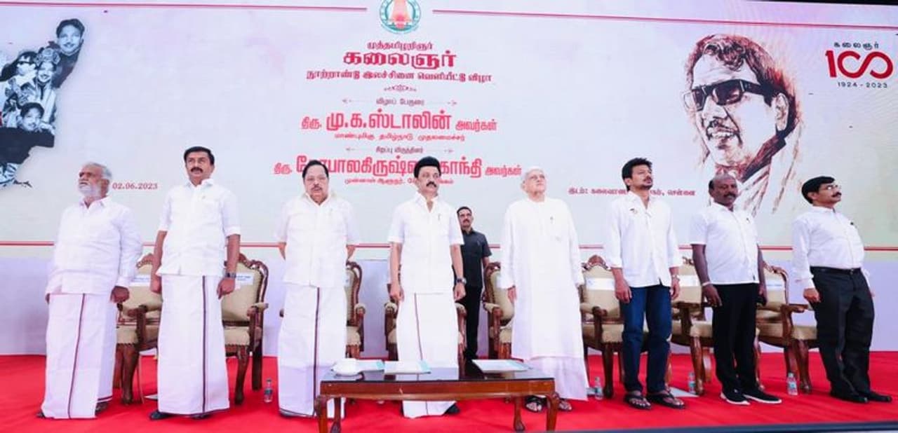 சென்னை கலைவாணர் அரங்கில், முன்னாள் முதலமைச்சர் கருணாநிதி நுற்றாண்டு விழாவுக்கான இலச்சினை வெளியீட்டு விழா முதலமைச்சர் ஸ்டாலின் தலைமையில் நடைபெற்று வருகிறது. இதில் மேற்கு வங்க முன்னாள் ஆளுநர் கோபாலகிருஷ்ண காந்தி சிறப்பு விருந்தினராக பங்கேற்று இலச்சினையை வெளியிட்டார். இதனை தொடர்ந்து நிகழ்ச்சியில் அமைச்சர் துரைமுருகன், சிறப்பு விருந்தினராக வந்திருக்கக்கூடிய , முன்னாள் மேற்கு வங்க கவர்னராக இருந்த போது, எந்த ஃபைலில் கையெழுத்து போடாமல் வைத்திருக்காமல், ஃபைல் வந்த உடனே கையெழுத்து போட்டு , சர்க்காருக்கு அனுப்பி, சர்காருக்கு எந்த தலைவலியையும் ஏற்படுத்தாமல், இருந்த மரியாதைக்குரிய கோபால கிருஷ்ண காந்தி அவர்களே வருக என வரவேற்றார்.
