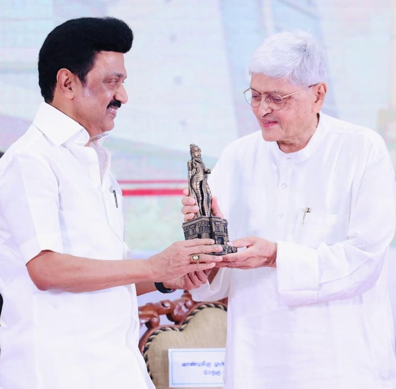 தொடர்ந்து பேசிய அவர், கருணாநிதி பெருமையை பேசிக்கொண்டே இருக்கலாம், அவரால் நாங்கள் வளர்ந்தோம் என்பதே பெருமை, அவருக்கு நூற்றாண்டு விழா எடுப்பது பெருமை, அதைவிட பெருமை நூற்றாண்டு விழா எடுக்கும் நேரத்தில் ஸ்டாலினை முதலமைச்சராக பொது மக்கள் அமர வைத்தார்களே அது பெருமை, வேற எவனையாவது உட்கார வைத்திருந்தால் சின்ன விளம்பரம் கூட கொடுத்திருக்க மாட்டார்கள். காலம் எந்த நேரத்தில் யாரை வைத்தால் என்ன நடக்கும் என முடிவு செய்துள்ளதாக தெரிவித்தார். இதனை தொடர்ந்து பேசிய முன்னாள் ஆளுநர் கோபால கிருஷ்ண காந்தி, முதலமைச்சர் ஸ்டாலின் பல யோசனைகளை கேட்டு என்னை போல அரசியலில் ஆனா ஆவன்னா கூட தெரியாத என்னை இந்த விழாவுக்கு அழைத்துள்ளதாக கருதுகிறேன்.