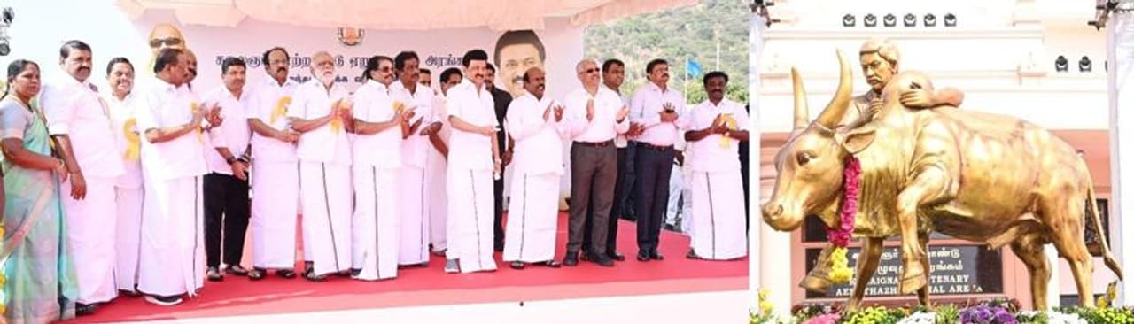 மதுரை மாவட்டம், அலங்காநல்லூர், கீழக்கரை கிராமத்தில் 66.80 ஏக்கர் நிலப்பரப்பில், 77,683 சதுரஅடி பரப்பளவில் 62.78 கோடி ரூபாய் செலவில் உலகத்தரத்துடன் கட்டப்பட்டுள்ள கலைஞர் நூற்றாண்டு ஏறுதழுவுதல் அரங்கத்தை திறந்து வைத்து, ஏறுதழுவுதல் போட்டிகளை தொடங்கி வைத்து முதலமைச்சர் ஸ்டாலின் பார்வையிட்டார். இதனை தொடர்ந்து நிகழ்சியில் பேசிய அவர், தமிழர் பண்பாட்டு விளையாட்டான ஏறுதழுவுதலுக்கு சங்கம் வளர்த்த மதுரையில் இந்த மாபெரும் அரங்கம் நம்முடைய திராவிட முன்னேற்றக் கழக அரசால் கட்டி எழுப்பப்பட்டிருக்கிறது.