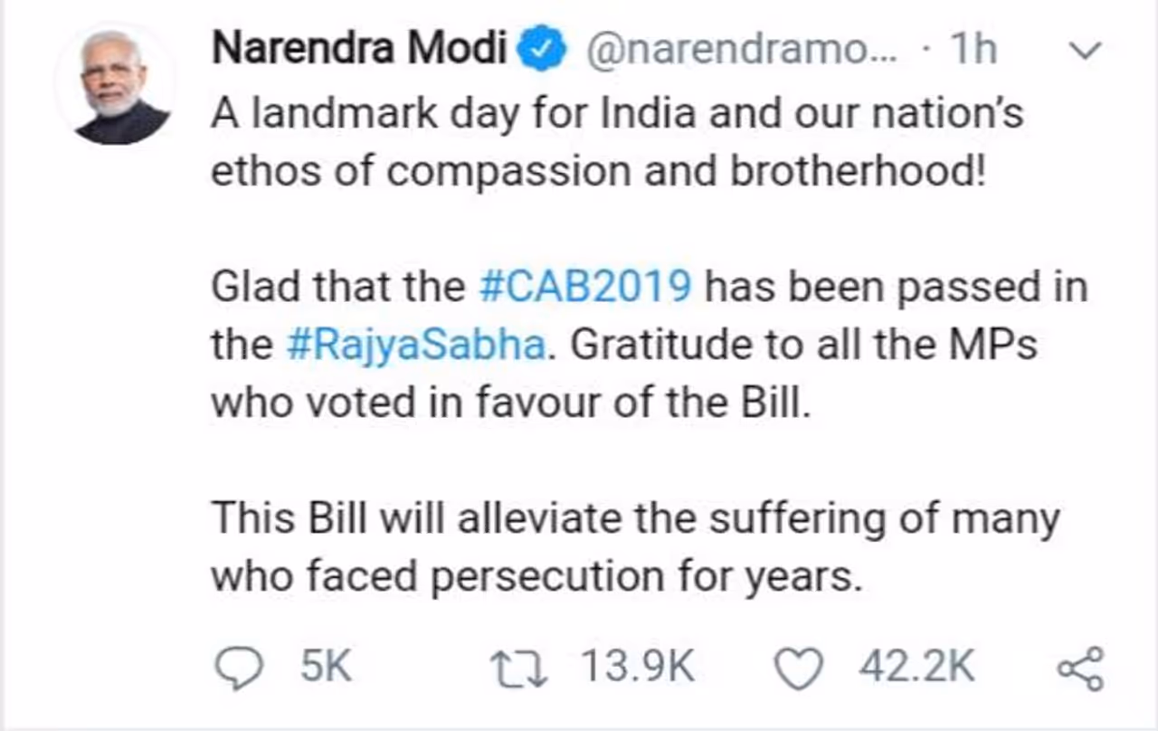 குடியுரிமை சட்டத்திருத்த மசோதா இரு அவைகளிலும் நிறைவேற்றப்பட்டதையடுத்து சகோதரத்துவத்திற்கான முக்கியமான நாள் இது என்று பிரதமர் மோடி கூறியுள்ளார்.