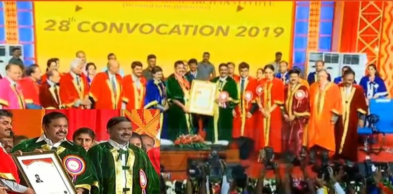 தமிழக முதல்வர் எடப்பாடி பழனிசாமிக்கு எம்.ஜி.ஆர். கல்வி ஆராய்ச்சி நிறுவனத்தின் பட்டமளிப்பு விழாவில் கவுரவ டாக்டர் பட்டம் வழங்கப்பட்டது.