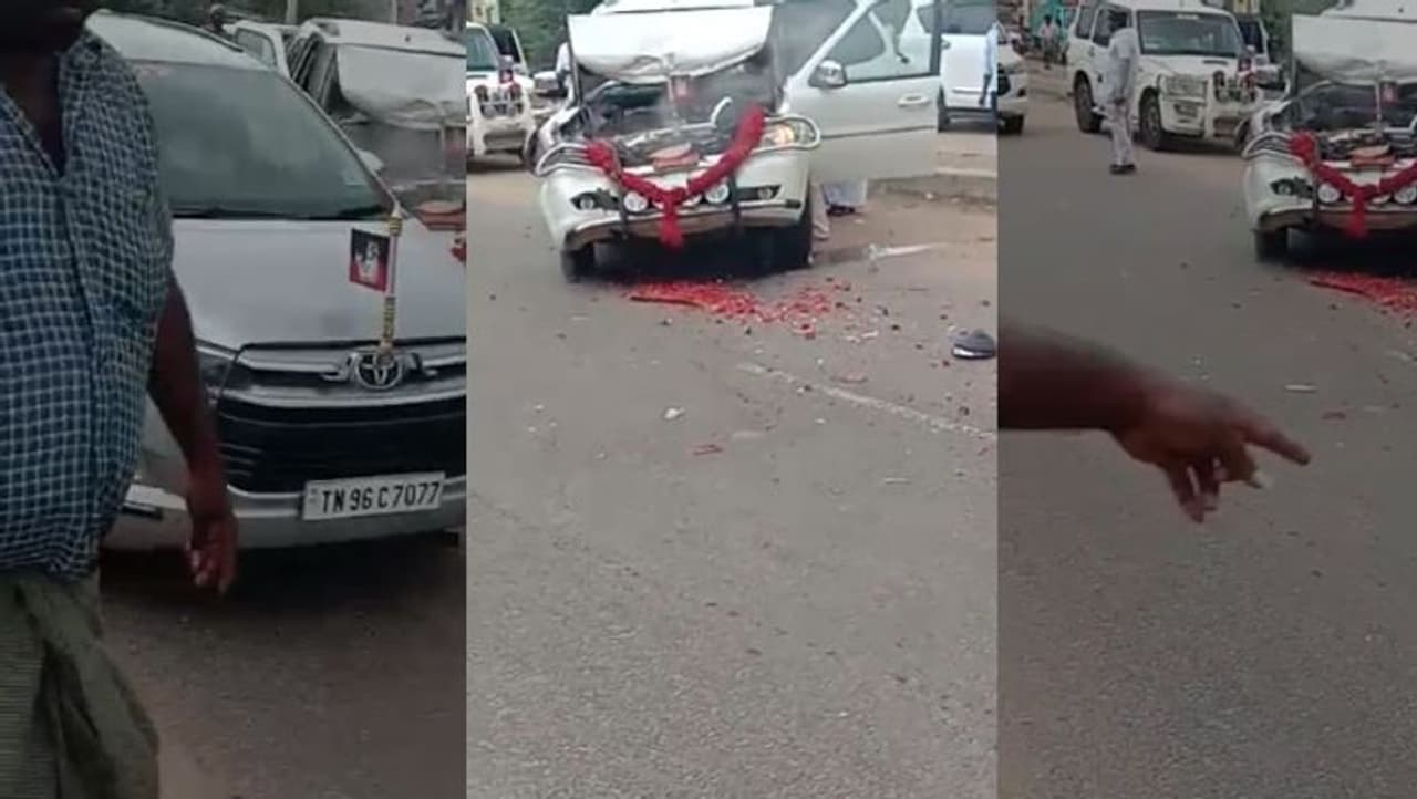 அங்கிருந்து இருவரும் கார்களில் வல்லநாடு வழியாக சேரன்மகாதேவிக்கு சென்று கொண்டிருந்தனர். வல்லநாடு பேருந்து நிலையம் அருகே சுமார் 3.10 மணிக்கு முதல்வர் காருக்கு பின்னால் வந்த கார்கள் போட்டி போட்டுக் கொண்டு சென்றன. அப்போது ஒரு கார் திடீரென சாலையை கடந்த கன்றுக்குட்டி மீது மோதி கட்டுப்பாட்டை இழந்து சென்டர் மீடியன் மீது மோதி நின்றது.