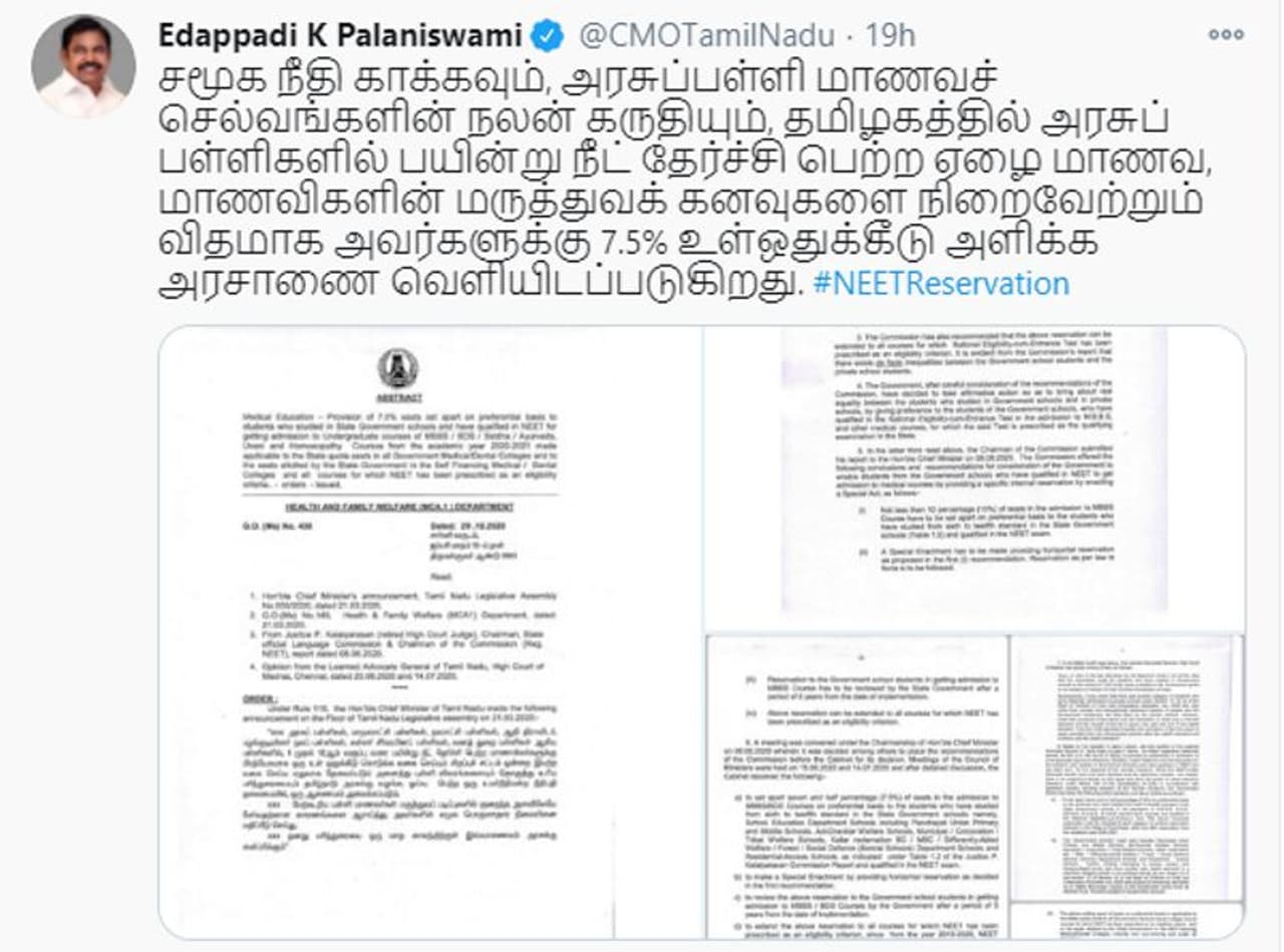 இதன் லேட்டஸ் சாராம்சங்களின் படி, அரசு பள்ளிகளில் 6-ம் வகுப்பு முதல் 12-ம் வகுப்பு வரையில் படித்து, நீட் தேர்வில் தகுதி பெறும் மாணவர்களுக்கு எம்.பி.பி.எஸ்., பி.டி.எஸ்., பி.எஸ்.எம்.எஸ்., பி.ஏ.எம். உள்ளிட்ட மருத்துவ படிப்புகளில் சேர்வதற்கு 7.5 சதவீதம் உள் ஒதுக்கீடு வழங்கப்படுகிறது. இந்த உள் ஒதுக்கீட்டின் படி நடக்கும் மாணவர் சேர்க்கையில் 2020-21ம் ஆண்டில் இருந்து 69 சதவீத இட ஒதுக்கீடு பின்பற்றப்படும்! என்பது உள்ளிட்ட தாராள சிறப்பம்சங்களைச் சொல்லி ஏழை, எளிய குடும்பங்களை சேர்ந்த தகுதியுள்ள பிள்ளைகளின் வயிற்றில் பாலை வார்த்துள்ளார்.