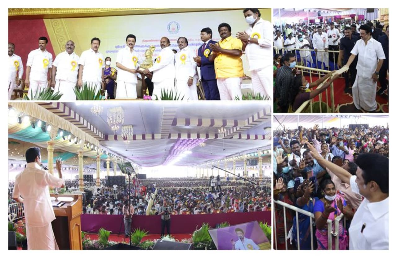 திருவண்ணாமலை மாவட்டத்தில் புதிய திட்டப்பணிகளுக்கு அடிக்கல் நாட்டி, முடிவுற்ற திட்டப் பணிகளை தொடங்கி வைத்து, பயனாளிகளுக்கு அரசு நலத்திட்ட உதவிகளை முதலமைச்சர் வழங்கினார். பின்னர் பேசிய முதலமைச்சர்,” அண்ணாமலையார் கோவில் என்பது தமிழ்நாட்டின் சொத்து. அதைக் கட்டிக் காத்தது கழக அரசு தான். இன்றைய அரசு விழாவில், பல்வேறு துறைகளின் சார்பாக, மொத்தம் 1 லட்சத்து 71 ஆயிரத்து 169 பயனாளிகளுக்கு 693 கோடி ரூபாய் மதிப்பிலான நலத்திட்ட உதவிகள் வழங்கப்பட இருக்கிறது.