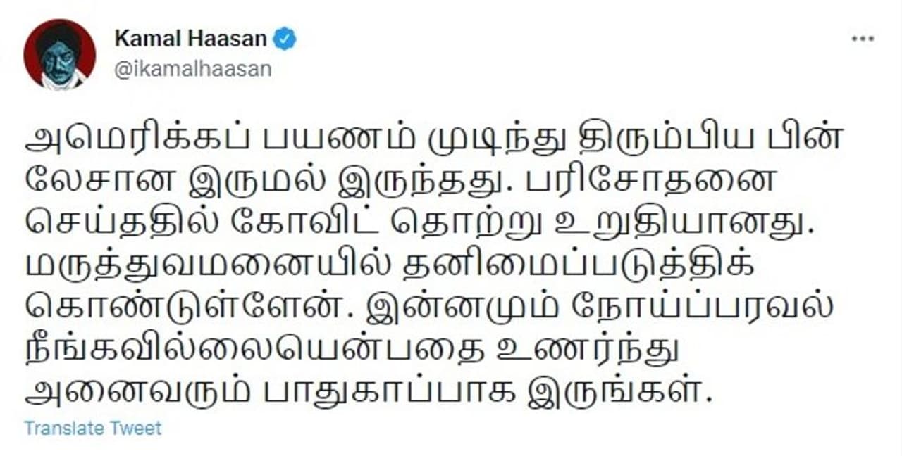 அதில், அமெரிக்கப் பயணம் முடிந்து திரும்பிய பின் லேசான இருமல் இருந்தது. பரிசோதனை செய்ததில் கோவிட் தொற்று (Coronavirus) உறுதியானது. மருத்துவமனையில் தனிமைப்படுத்திக் கொண்டுள்ளேன். இன்னமும் நோய்ப்பரவல் நீங்கவில்லையென்பதை உணர்ந்து அனைவரும் பாதுகாப்பாக இருங்கள் எனப் பதிவிட்டுள்ளார். இதை அடுத்து முன்னதாக அவருக்கு தனியார் மருத்துவமனைக்கு உடல் பரிசோதனைக்காக சென்ற போது அவருக்கு லேசான காய்ச்சல் காரணமாக பரிசோதனை சென்றுள்ளதாக தகவல்கள் வெளியான நிலையில், அவருக்கு கோவிட் தொற்று இருப்பது உறுதியாகி உள்ளது. இதை அடுத்து அவர் சென்னை போரூரில் உள்ள ஸ்ரீ ராமச்சந்திரா மருத்துவமனையில் அனுமதிக்கப்பட்டுள்ளார். அங்கு அவருக்கு சிகிச்சை அளிக்கப்பட்டு வருகிறது.