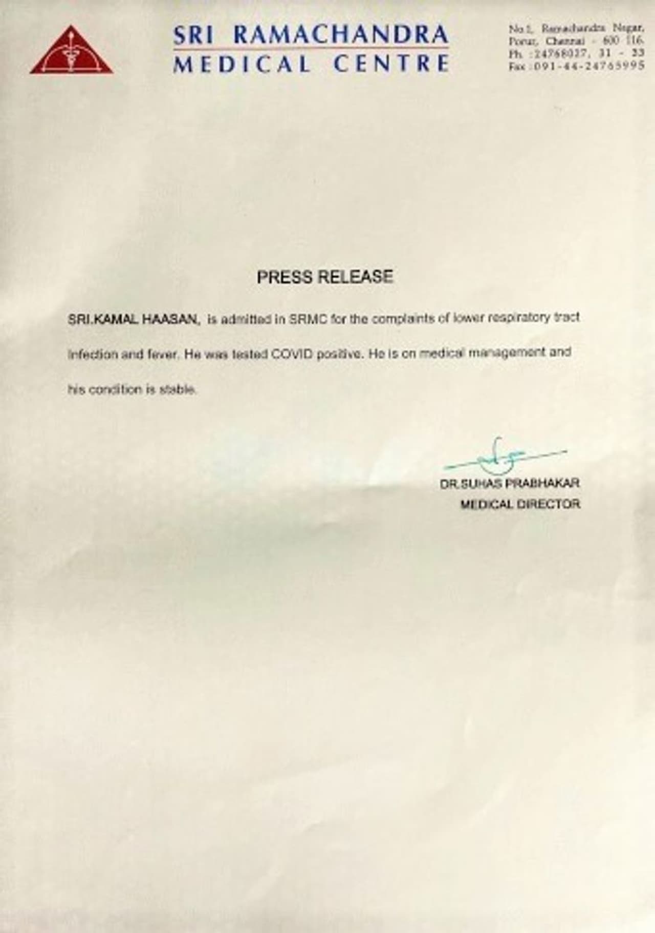 இந்த நிலையில் கமல்ஹாசன் உடல்நிலை குறித்து ஸ்ரீ ராமச்சந்திரா மருத்துவமனை அறிக்கை ஒன்றை வெளியிட்டுள்ளது. அதில், கமல்ஹாசன் சுவாச பாதையில் தொற்று பாதிப்பு மற்றும் காய்ச்சலுடன் மருத்துவமனையில் அனுமதிக்கப்பட்டதாகவும் அவருக்கு கொரோனா பாதிப்பு உறுதி செய்யப்பட்டுள்ளதாகவும் தெரிவிக்கப்பட்டுள்ளது. மேலும் அவரது உடல்நிலை தற்போது சீராக உள்ளதாகவும் அவரது உடல்நிலையை மருத்துவர்கள் தொடர்ந்து கண்காணித்து வருவதாகவும் மருத்துவமனையின் அறிக்கையில் தெரிவிக்கப்பட்டுள்ளது.