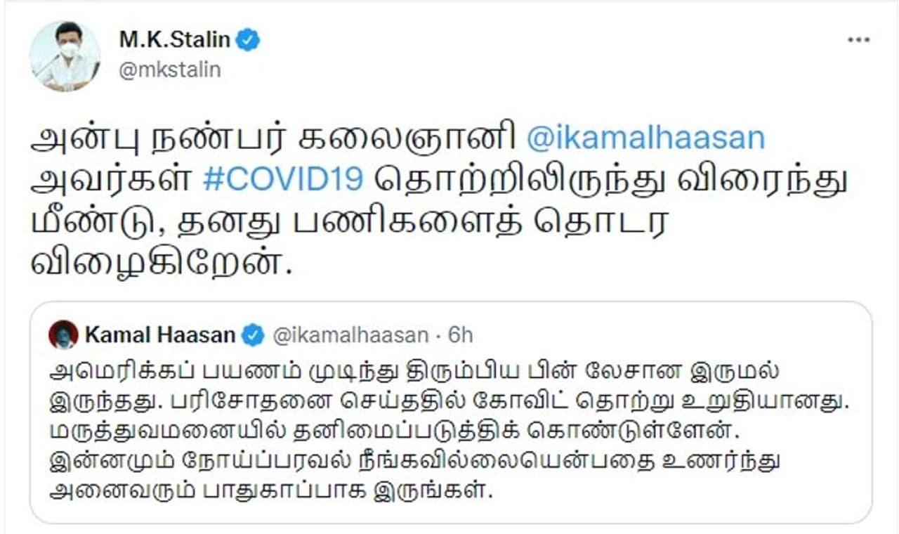 கமல்ஹாசன் விரைவில் கொரோனா பாதிப்பிலிருந்து மீண்டு வரவேண்டும் என்று முதலமைச்சர் மு.க.ஸ்டாலின் வாழ்த்து தெரிவித்துள்ளார். கமல்ஹாசன் விரைவில் கொரோனா பாதிப்பிலிருந்து மீண்டு வரவேண்டும் என்று முதலமைச்சர் மு.க.ஸ்டாலின் தெரிவித்துள்ளார். மக்கள் நீதி மய்யம் கட்சி தலைவர் கமல்ஹாசன் அமெரிக்காவுக்கு சென்றுவிட்டு சென்னை திரும்பியுள்ளார். இதை அடுத்து அவருக்கு லேசான இருமல் இருந்துள்ளது. இதை அடுத்து அவருக்கு கொரோனா பரிசோதனை மேற்கொள்ளப்பட்டதாக தெரிகிறது. அதில் அவருக்கு கொரோனா உறுதி செய்யப்பட்டுள்ளது. இதை அடுத்து அவர் தனது டிவிட்டர் பக்கத்தில் இதுக்குறித்து பதிவிட்டுள்ளார்.