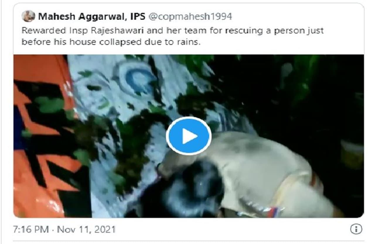 மேலும் காவல் ஆய்வாளர் ராஜேஸ்வரிக்கு தனது பாராட்டுகளையும் வாழ்த்துகளையும் தெரிவித்தார். சென்னை டி.பி.சத்திரம் காவல் நிலையத்தைச் சேர்ந்த காவல் ஆய்வாளர் ராஜேஸ்வரி, ஏற்கனவே கர்ப்பிணிப் பெண்ணுக்குப் பிரசவம் பார்க்க உதவி செய்வது, மாற்றுத்திறனாளி பெண்ணுக்குத் தன் செலவில் சீர் செய்து திருமணம் நடத்தி வைத்தது, கொரோனாவால் உயிரிழந்த ஏழை ஒருவரின் உடலைத் தகனம் செய்ய உதவி செய்தது, ஆதரவற்றோருக்குத் தன்னுடன் பணியாற்றுவோருடன் இணைந்து உணவு, மருந்து ஆகியவற்றைக் கொரோனா காலத்தில் கொடுத்து உதவியது எனத் தொடர்ந்து மக்கள் பணியில் ஈடுபட்டு வந்தார் என்பது குறிப்பிடத்தக்கது.
