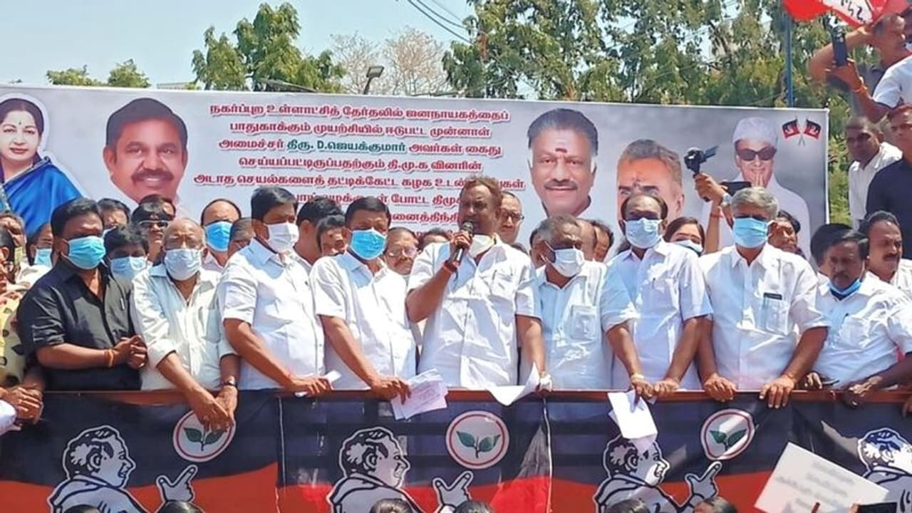 முன்னாள் அமைச்சர் டி.ஜெயக்குமார் மீதான கைது நடவடிக்கையைக் கண்டித்தும், அதிமுக அரசால் கொண்டுவரப்பட்ட சாலைகள், பாலங்கள், குடிநீர் பணிகள், ஸ்மார்ட் சிட்டி திட்டப் பணிகள் உள்ளிட்ட பல்வேறு திட்டப்பணிகளை வேகமாக முடித்திட வலியுறுத்தியும் கோவை தெற்கு வட்டாட்சியர் அலுவகம் அருகே அதிமுக சார்பில் நேற்று கண்டன ஆர்ப்பாட்டம் நடைபெற்றது.