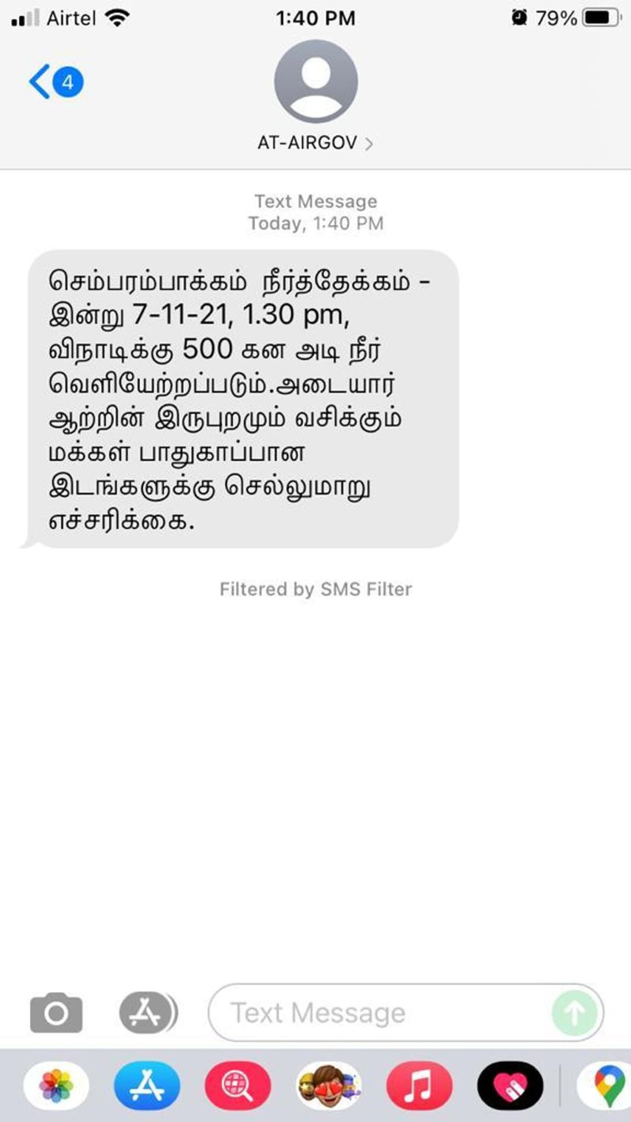 இதே போல காஞ்சிபுரம் மாவட்ட கலெக்டர் விடுத்துள்ள அறிவிப்பில், செம்பரம்பாக்கம் ஏரியில் மதியம் 1.00 மணி முதல் 1.30 மணிக்குள் நீர் திறப்பு ஆரம்பமாகும் என்றும், இதனால் நத்தம், குன்றத்தூர் , நத்தம்பாக்கம்,வழுதலம்பேடு, பூந்தண்டலம், பழந்தண்டலம் ,எருமையூர், திருமுடிவாக்கம் பகுதி மக்கள் பாதுகாப்பாக இருக்குமாறும் கேட்டு கொண்டுள்ளார். செம்பரம்பாக்கம் அணை கொள்ளளவு 25.55 அடி ஆகும். இதில் தற்போது அணையின் நீர் இருப்பு 21.22 அடியாக உள்ளது. அதே போல பூண்டி ஏரியில் இருந்தும் உபரி நீர் திறப்பு அதிகரிக்கப்பட உள்ளது. வினாடிக்கு 4000 கன அடி வீதம் நீர் வெளியேற்றப்பட உள்ளதாக அறிவிக்கப்பட்டுள்ளது. இந்நிலையில் சென்னையில் அடையாறு மற்றும் கூவம் ஆற்றங்கரையோரம் வசிக்கும் மக்கள் பாதுகாப்பாக இருக்கும் படி எஸ்.எம்.எஸ் மூலமும் எச்சரிக்கை விடுக்கப்பட்டுள்ளது.