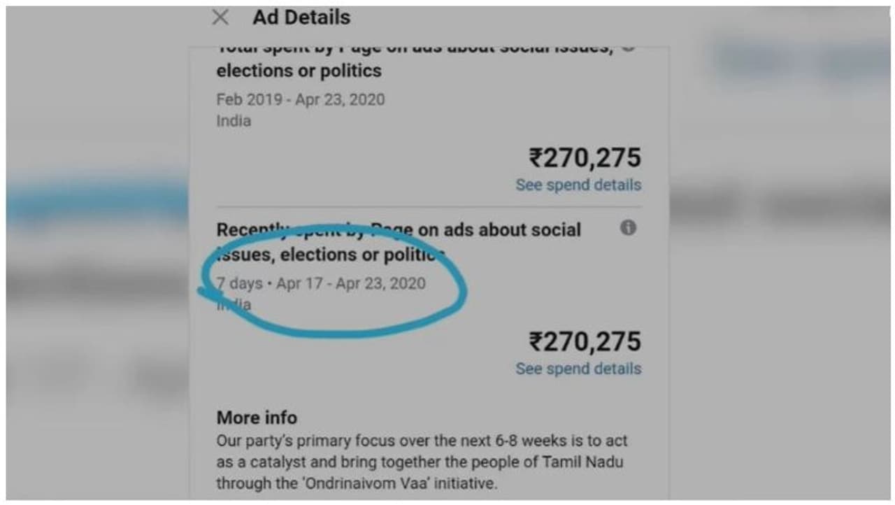 இந்த ஒன்றிணைவோம் வா இயக்கத்தை முகநூல் பக்கத்தில் விளம்பரப்படுத்த மட்டும் 7 நாட்களுக்கு 2 லட்சத்து 70 ஆயிரத்து 275 ரூபாய் செலவு செய்துள்ளது திமுக தலைமை. அதாவது ஒரு நாளைக்கு தலா 40 ஆயிரம் ரூபாய். ஃபேஸ்புக் பணத்தில் பணத்தை கட்டினால் பல்லாயிரக்கணக்கானோரில் முக நூல் கணக்கில் இந்த விளம்பரம் சென்று சேரும்.