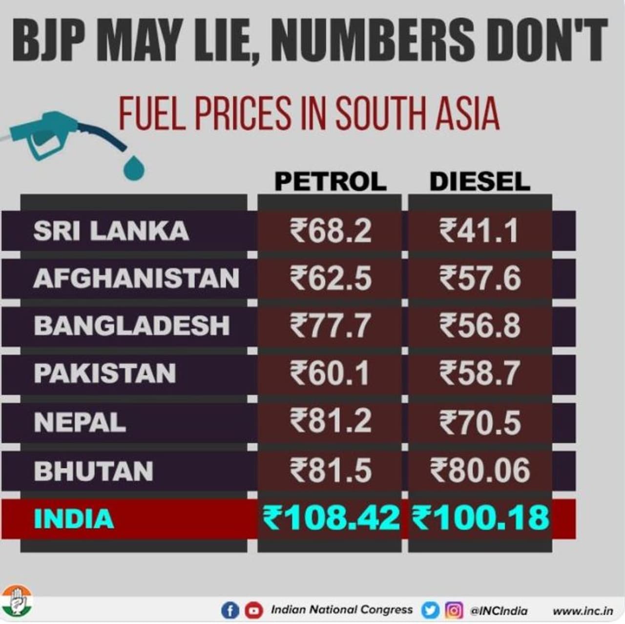 இப்படி ஒரு பட்டியலை ரிலீஸ் செய்துள்ள காங்கிரசானது இந்தியாவில் மட்டும் ஒரு லிட்டர் பெட்ரோல் ரூ.108. 42 காசுகளாகவும், டீசல் ரூ.100.18 காசுகளாகவும் இருக்கிறது என்று குறிப்பிட்டு உள்ளது.