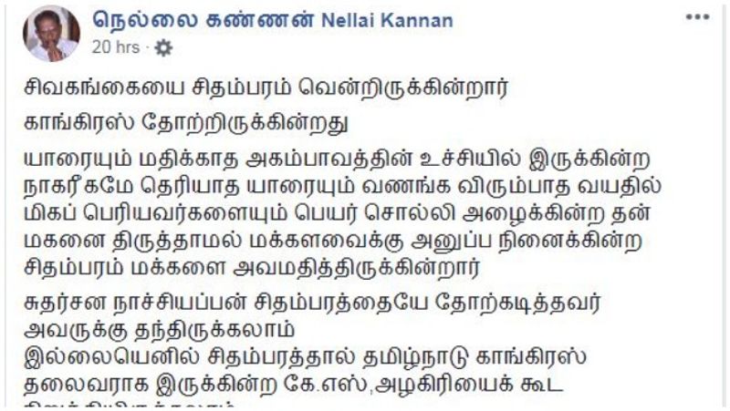 இதுகுறித்து இலக்கியவாதியும், காங்கிரஸ் கட்சியின் தலை சிறந்த பேச்சாளராகவும் இருந்த நெல்லை கண்ணன் தனது முகநூல் பக்கத்தில் கருத்து தெரிவித்துள்ளார். அதில், ‘’சிவகங்கையை சிதம்பரம் வென்றிருக்கின்றார். காங்கிரஸ் தோற்றிருக்கிறது. யாரையும் மதிக்காத அகம்பாவத்தின் உச்சியில் இருக்கின்ற நாகரீகமே தெரியாத யாரையும் வணங்க விரும்பாத வயதில் மிகப் பெரியவர்களையும் பெயர் சொல்லி அழைக்கின்ற தன் மகனை திருத்தாமல் மக்களவைக்கு அனுப்ப நினைக்கின்ற சிதம்பரம் மக்களை அவமதித்திருக்கின்றார்.