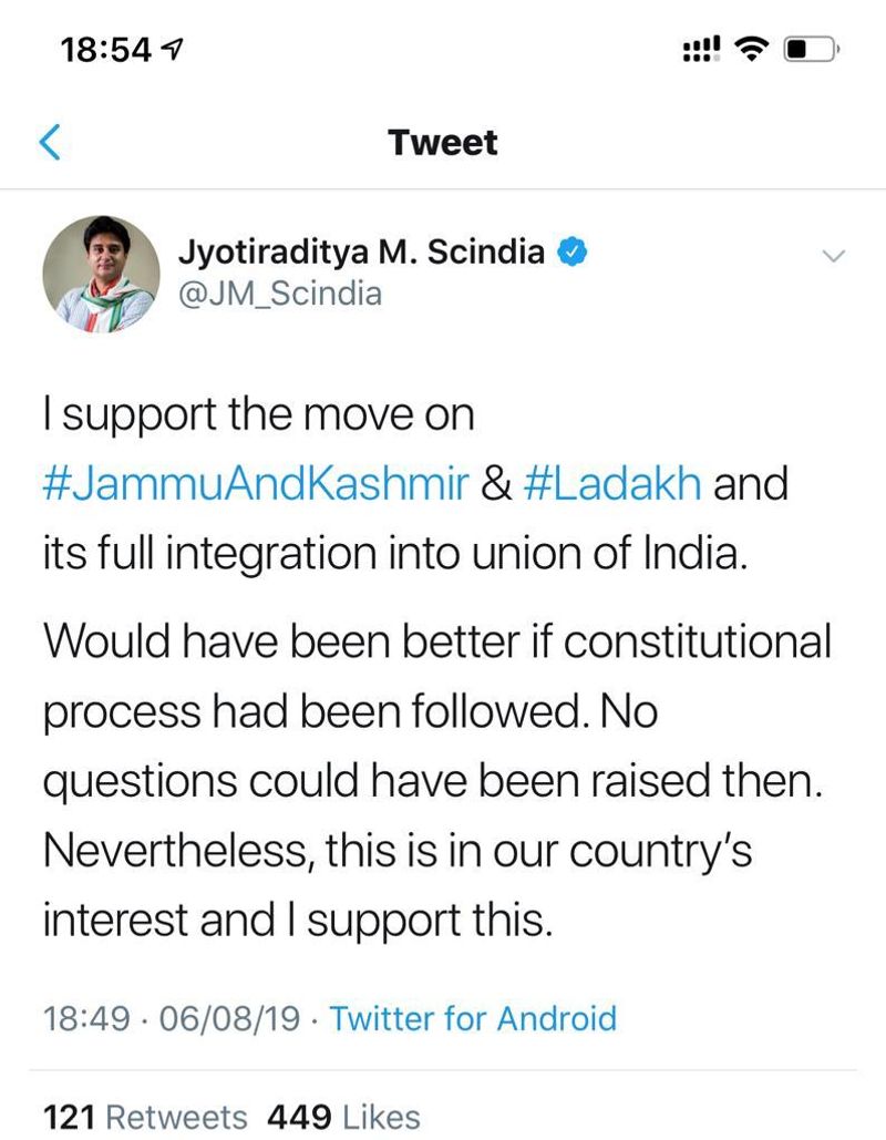 காஷ்மீர் மாநிலத்துக்கு வழங்கப்பட்டிருந்த சிறப்பு அந்தஸ்து ரத்து செய்யப்பட்டதற்கு காங்கிரஸ் கட்சி கடும் எதிர்ப்புத் தெரிவித்திருந்த நிலையில், அக்கட்சியின் முக்கிய தலைவரும், ராகுல் காந்தியின் நெருங்கிய நண்பருமான ஜோதிராதித்ய சிந்தியா, ஆதரவு தெரிவித்து டுவிட்டரில் பதிவிட்டிருப்பது அதிர்ச்சியை ஏற்படுத்தியுள்ளது.
