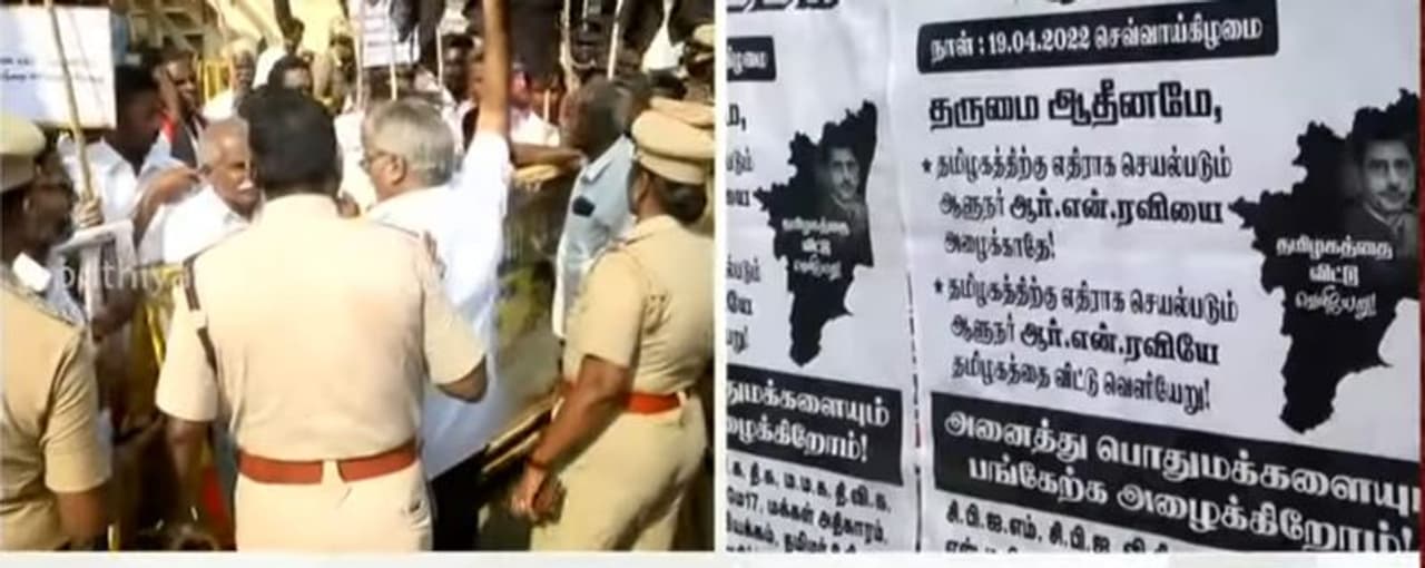 மயிலாடுதுறை மாவட்டத்தில் உள்ள தொன்மை வாய்ந்த தருமபுரம் ஆதீனத்தின் 27-ஆவது குருமகா சன்னிதானம் ஸ்ரீலஸ்ரீ மாசிலாமணி தேசிக ஞானசம்பந்த பரமாசாரிய சுவாமிகள் இன்று ஞானரத யாத்திரை புறப்பட்டார். இந்த நிகழ்வை தமிழக ஆளுநர் ஆர்.என்.ரவி தொடங்கி வைப்பதற்காக மயிலாடுதுறைக்கு சென்றார். ஆளுநர் ஆர்.என் ரவியின் வருகைக்கு எதிர்ப்பு தெரிவித்து மயிலாடுதுறையில் விடுதலை சிறுத்தைகள், கம்யூனிஸ்ட் கட்சி உள்ளிட்ட திமுக கூட்டணி கட்சியினர் கறுப்புக் கொடி ஆர்ப்பாட்டம் ஈடுபட்டனர். ஆளுநர் வந்தபோது அவருடைய வாகனம் மீது கொடி கம்புகள் வீசப்பட்டன. ஆளுநருக்கு எதிராக நடைபெற்ற இந்தப் போராட்டத்தில் சுமார் 150க்கும் மேற்பட்டோரை போலீசார் கைது செய்தனர்.