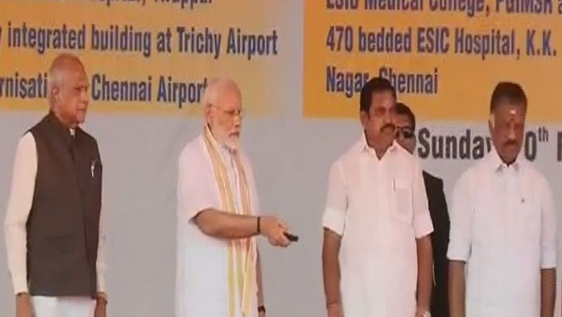 பிரதமர் மோடி அரசு விழாவில் கலந்து கொள்வதற்காக 2-வது முறையாக தமிழகம் வந்துள்ளார். இந்த அரசு விழாவில் இஎஸ்ஐ மருத்துவமனைக்கு அடிக்கல் நாட்டினார். இதை தொடர்ந்து சென்னை டிஎம்எஸ்- வண்ணாரப்பேட்டை இடையிலான மெட்ரோ வழித் திட்டத்தை தொடங்கி வைத்தார். இதனையடுத்து பெருமாநல்லூரில் பாஜக சார்பில் ஏற்பாடு செய்யப்பட்டுள்ள பொதுக்கூட்டத்தில் கலந்து கொண்டு பிரதமர் மோடி உரையாற்றினார்.