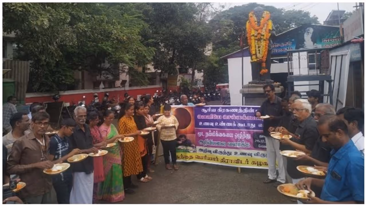 சூரிய கிரகணம் தொடர்பான மூட நம்பிக்கைகளை முறியடிக்கும் விதமாக சென்னை வேப்பேரி பெரியார் திடலில் திராவிட கழகத்தினர் சார்பில் சிற்றுண்டி உண்ணும் நிகழ்வு நடைபெற்றது. சூரிய கிரகணத்தின்போது கர்ப்பிணி பெண்கள் குழந்தைகள் வெளியே வரக்கூடாது என்றும் உணவு உண்ணக்கூடாது என்னும் பல மூட நம்பிக்கைகளை இருப்பதால், அதை பொய் என விளக்கும் நடைமுறை வகுப்பு நடைபெற்றது.