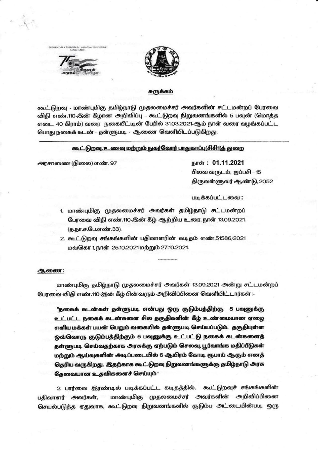 கடந்த சட்டமன்றத் தேர்தலில்போது, கூட்டுறவு வங்கிகளில் 5 சவரனுக்கு உட்பட்ட நகை கடன்கள் தள்ளுபடி செய்யப்படும் என்று திமுக தனது தேர்தல் அறிக்கையில் அறிவித்தது. இது தொடர்பான அறிவிப்பை கடந்த செப்டம்பர் மாதம் சட்டமன்றக் கூட்டத்தொடரின் போது விதி எண் 110இன் கீழ் முதல்வர் ஸ்டாலின் வெளியிட்டார். ஆனால், இது தொடர்பான அரசாணை வெளியிடப்படாமல் இருந்தது. தற்போது வெளியாகியுள்ளது.