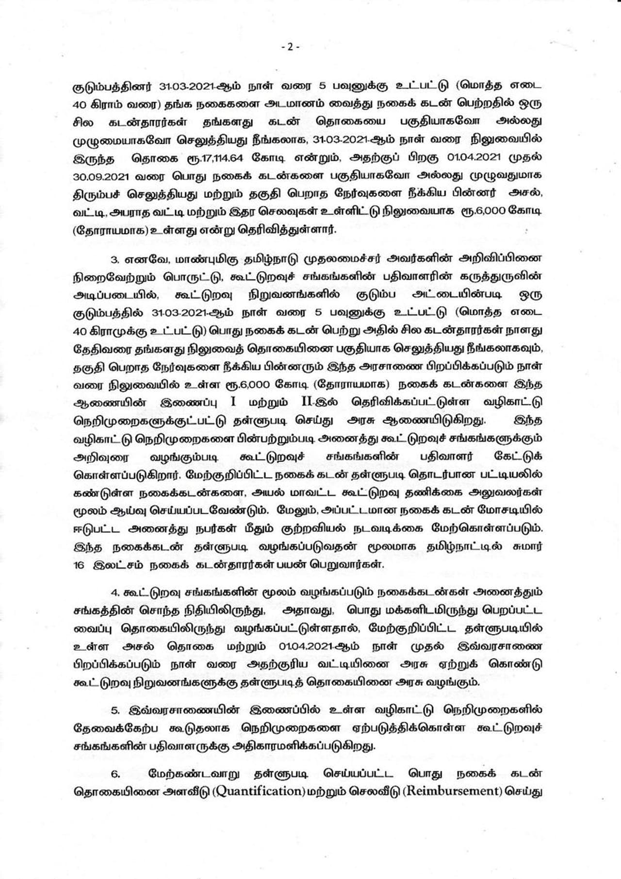 * பார்வை இரண்டில் படிக்கப்பட்ட கடிதத்தில், கூட்டுறவுச் சங்கங்களின் பதிவாளர் அவர்கள், மாண்புமிகு முதலமைச்சர் அவர்களின் அறிவிப்பினை செயல்படுத்த ஏதுவாக, கூட்டுறவு நிறுவனங்களில் குடும்ப அட்டையின்படி ஒரு குடும்பத்தினர் 3103-2021ஆம் நாள் வரை 5 பவுனுக்கு உட்பட்டு (மொத்த எடை 40 கிராம் வரை) தங்க நகைகளை அடமானம் வைத்து நகைக் கடன் பெற்றதில் ஒரு சில கடன்தாரர்கள் தங்களது கடன் தொகையை பகுதியாகவோ அல்லது முழுமையாகவோ செலுத்தியது நீங்கலாக, 3103-2021ஆம் நாள் வரை நிலுவையில் இருந்த தொகை ரூ.17,11464 கோடி என்றும், அதற்குப் பிறகு 01:042021 முதல் 30.002021 வரை பொது நகைக் கடன்களை பகுதியாகவோ அல்லது முழுவதுமாக திரும்பச் செலுத்தியது மற்றும் தகுதி பெறாத நேர்வுகளை நீக்கிய பின்னர் அசல், வட்டி,அபராத வட்டி மற்றும் இதர செலவுகள் உள்ளிட்டு நிலுவையாக ரூ.6,000 கோடி (தோராயமாக) உள்ளது என்று தெரிவித்துள்ளார்.