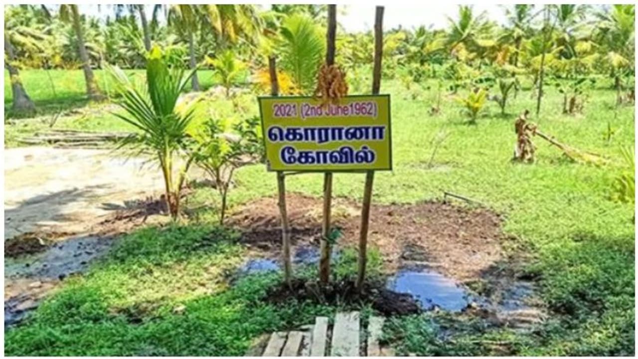 இந்நிலையில், தேனி மாவட்டம், ஆண்டிபட்டி அருகே உள்ள அம்மச்சியாபுரம் கிராமத்தை சேர்ந்த 90 வயது ஓய்வு பெற்ற மின்வாரிய பொறியாளர் ராஜரத்தினம் என்பவர், தனது விவசாய தோட்டத்தில் கொரோனா கோயில் கட்டுவதற்கான பணிகளை தொடங்கியுள்ளார். முதல்கட்டமாக கோயிலுக்கான பெயர் பலகையை வைத்துள்ள அவர், விரைவில் கோயில் கட்டும்பணியை தொடங்க இருப்பதாகவும் அவர் தெரிவித்தார்.