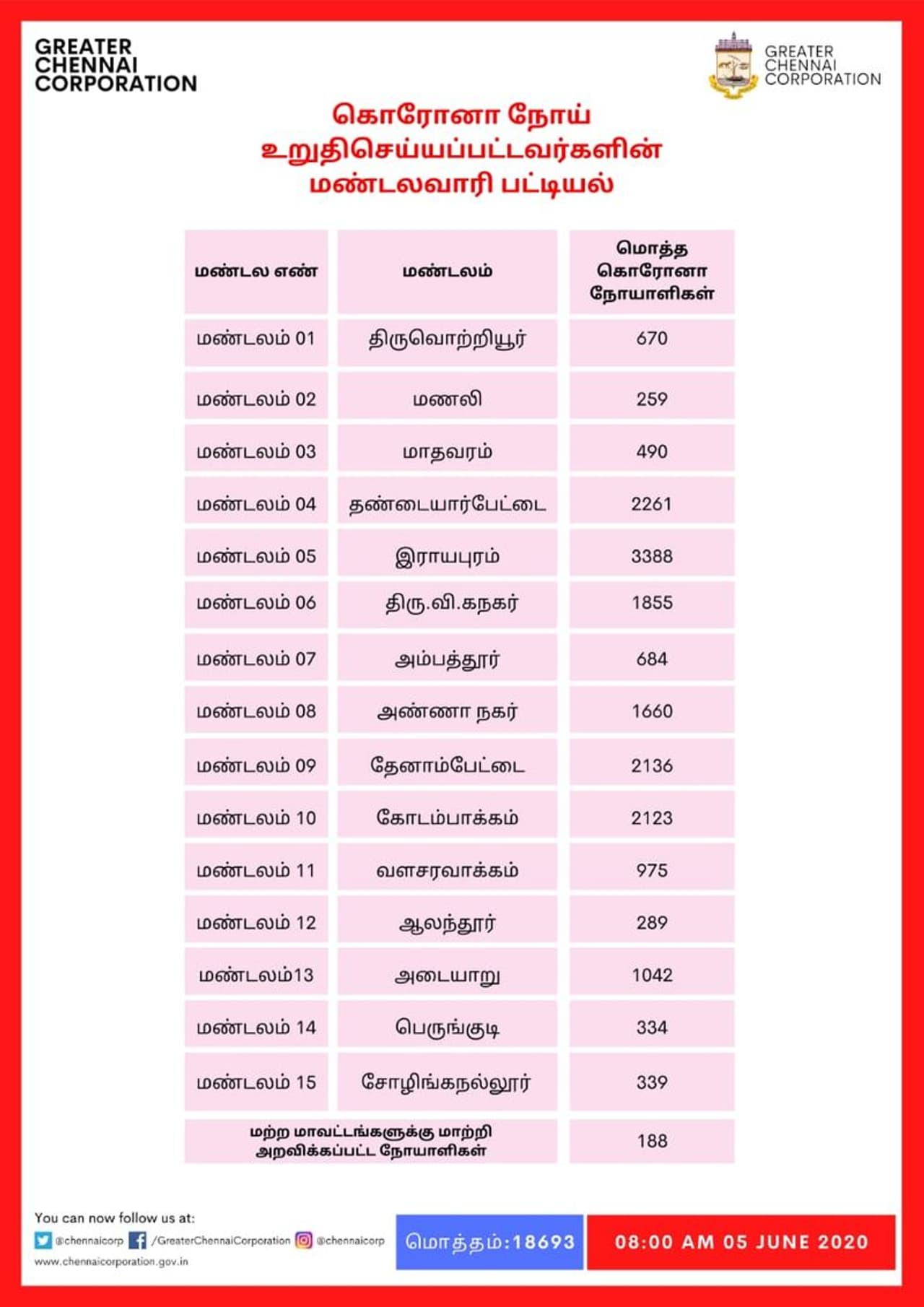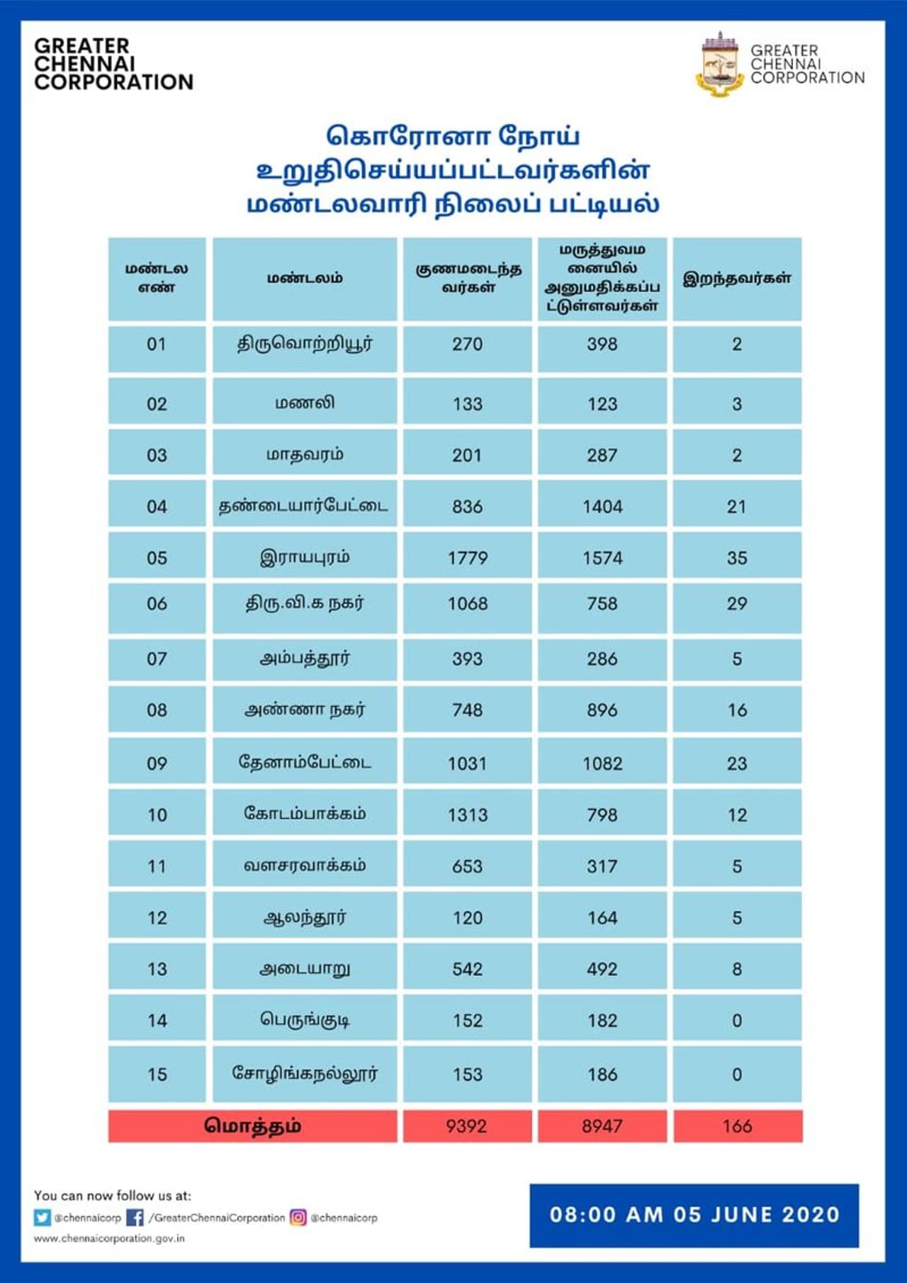 சென்னையில் அதிகபட்சமாக ராயபுரம் மண்டலத்தில் 3,388 பேருக்கும், தண்டையார்பேட்டை மண்டலத்தில் 2,261 பேருக்கும், தேனாம்பேட்டை மண்டலத்தில் 2,136 பேருக்கும் கோடம்பாக்கம் மண்டலத்தில் 2,123 பேருக்கும், திருவிக நகர் மண்டலத்தில் 1,855 பேருக்கும், அண்ணா நகர் மண்டலத்தில் 1,660 பேருக்கும், அடையாறு மண்டலத்தில் 1,042 பேருக்கும், வளசரவாக்கம் மண்டலத்தில் 975 பேருக்கும் கொரோனா தொற்று உறுதி செய்யப்பட்டுள்ளதாக சென்னை மாநகராட்சி தெரிவித்துள்ளது. மொத்தம் உள்ள 15 மண்டலங்களில் மிகக் குறைந்த அளவு மணலியில் 299 பேர் கொரோனாவால் பாதிக்கப்பட்டுள்ளதாக சென்னை மாநரகராட்சி தெரிவித்துள்ளது. சென்னையில் இதுவரை கொரோனாவால் பாதிக்கப்பட்டவர்களில் 50.8% பேர் குணமடைந்துள்ளனர், இதில் மொத்தம் உயிரிழந்தவர்களின் எண்ணிக்கை 0.8 சதவீதமாக பதிவாகியுள்ளது குறிப்பிடத்தக்கது. சென்னையில் கொரோனா வைரஸ் தாக்கம் நாளுக்கு நாள் அதிகரித்து வரும் நிலையில் அடுத்த ஒரு மாதத்திற்கு அனைவரும் கட்டாயம் முக கவசம் அணிய வேண்டும், போதிய சமூக இடைவெளியை கடைப்பிடிக்க வேண்டுமென வலியுறுத்தியுள்ள கொரோனா நோய் தடுப்பு சிறப்பு அதிகாரி டாக்டர் ராதாகிருஷ்ணன், இதை கடைபிடித்தால் மட்டுமே நோய்த்தொற்றை கட்டுப்படுத்த முடியும் எனவும் கூறியுள்ளார்.