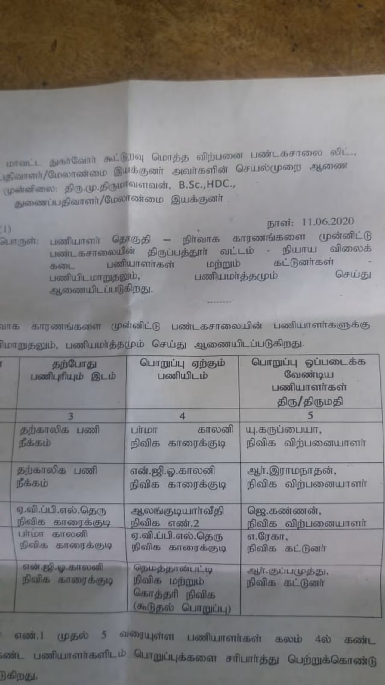 மாவட்ட ஆட்சியர் ஜெயகாந்தன் முறைகேட்டில் ஈடுபட்ட ரேசன் கடை ஊழியர் மீது கடும் நடவடிக்கை எடுக்க உத்தரவிட்டிருந்தார் என்பது குறிப்பிடத்தக்கது.இந்த நிலையில் மீண்டும் விற்பனையாளர் பாலுக்கு காரைக்குடியிலேயே வேலை போட்டுக்கொடுத்திருக்கிறார் மேலாண்மை இயக்குனர் திருமாவளவன்.பள்ளத்தூர் பாம்கோ இரண்டு ரேசன் கடைக்கும் ஒரே பெண் ஊழியர் நியமிக்கப்பட்டுள்ளார் என்கிறார்கள் சமூக ஆர்வலர்கள்.